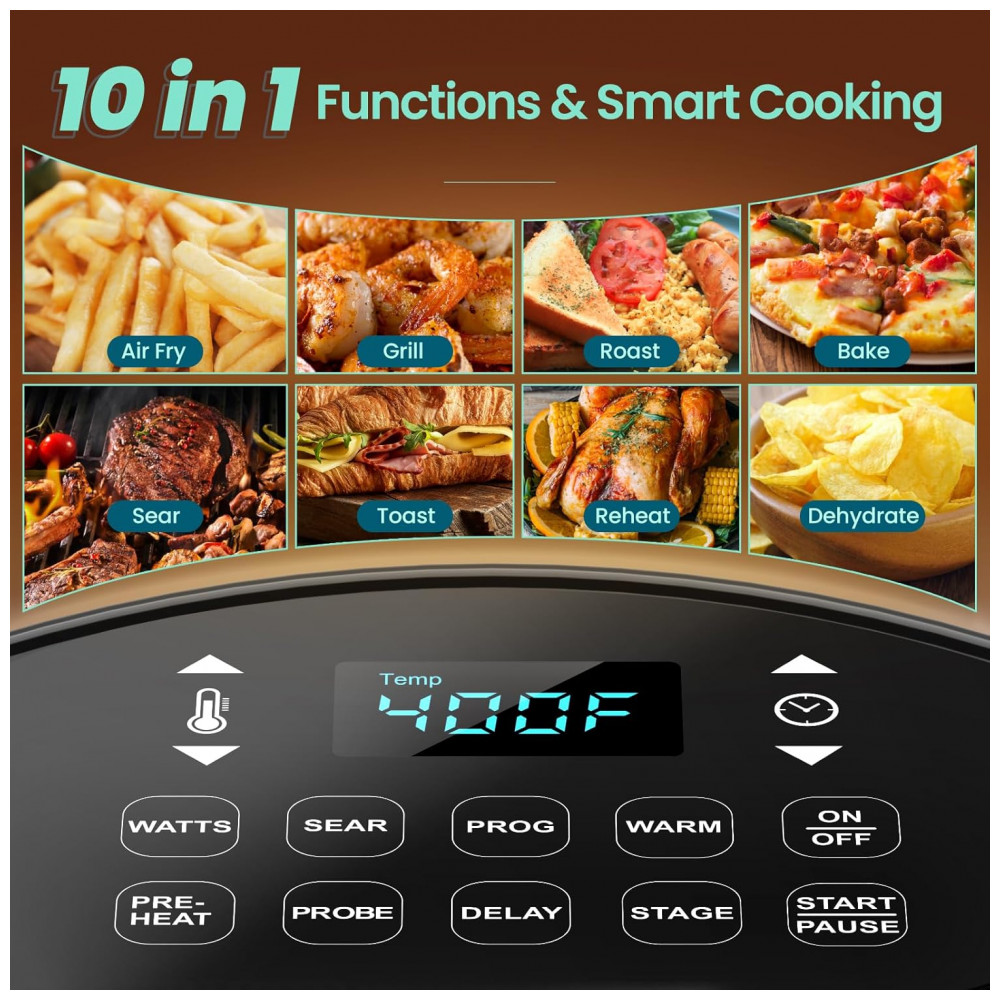 Funções pré-programadas (10 em 1): Air Fry, Grill, Roast, Sear, Toast, Reheat, Preheat, Dehydrate, Bake, Warm