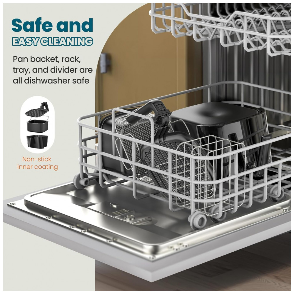 A Brio conta com sonda térmica digital integrada para monitoramento da temperatura interna dos alimentos, desligando automaticamente o aquecimento quando o valor configurado é atingido. O conjunto de acessórios inclui grelha antiaderente, grade reversível, divisória removível para o cesto, assadeira antiaderente e kit para preparo de café da manhã, ampliando as possibilidades de uso para grelhar, assar em múltiplos níveis e desidratar. Cesto e bandejas possuem revestimento antiaderente e são compatíveis com lava-louças, simplificando a rotina de limpeza.