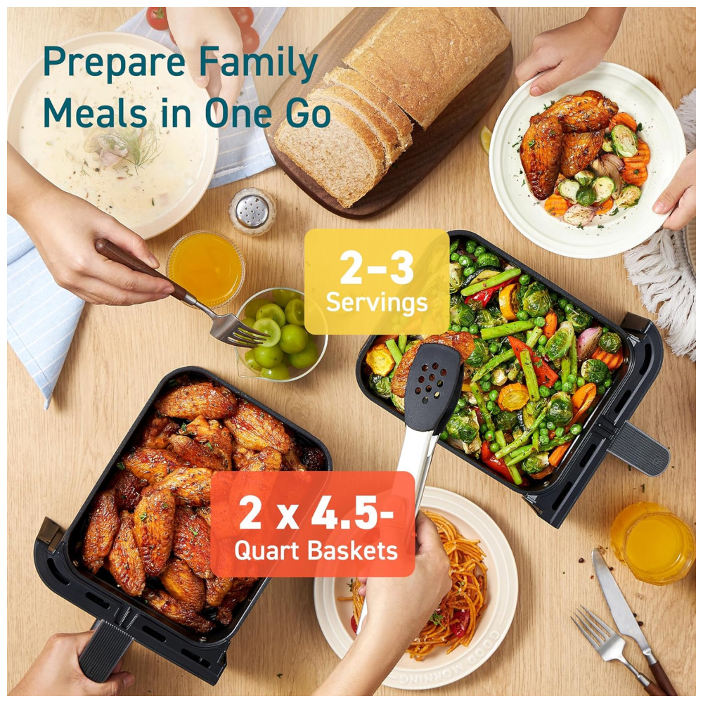 Capacidade de 9 Litros: Com um amplo espaço de cozimento, composto por duas zonas independentes de 4,5 litros cada, esta air fryer atende às necessidades de preparo de refeições tanto para famílias quanto para indivíduos.