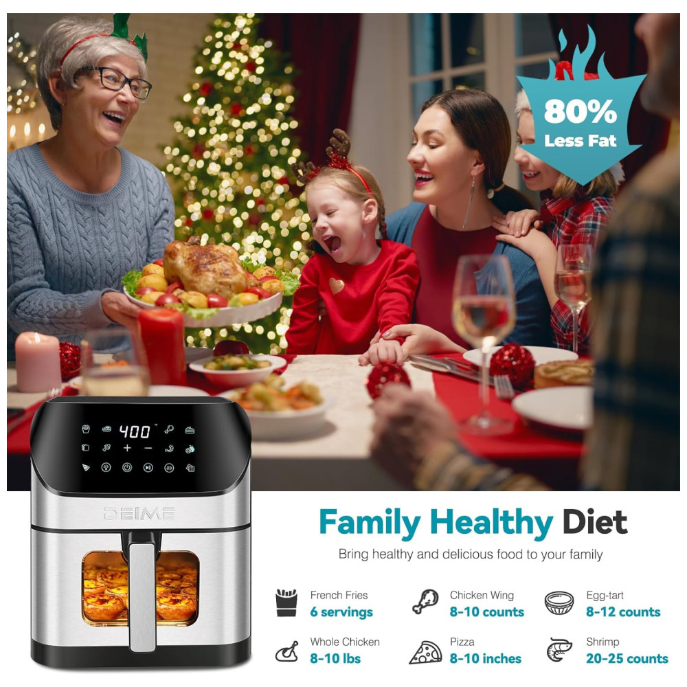 A Escolha Saudável: Nossa fritadeira com circulação de ar quente a 360° e capacidade de 8 litros e 1700W de potência. Pode acomodar um frango de 3,6-4,5 kg, uma pizza de 20-25 cm, 12-15 asas de frango, 3 bifes ou 600-800 g de batatas fritas. Faça seus alimentos ficarem crocantes e macios com pouco ou nenhum óleo. Você pode desfrutar de suas refeições favoritas sem se preocupar com calorias e gorduras adicionais.