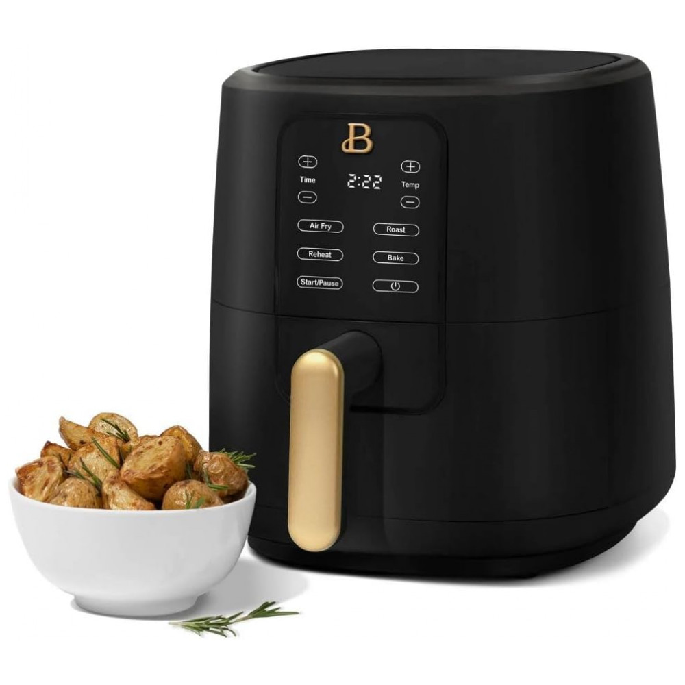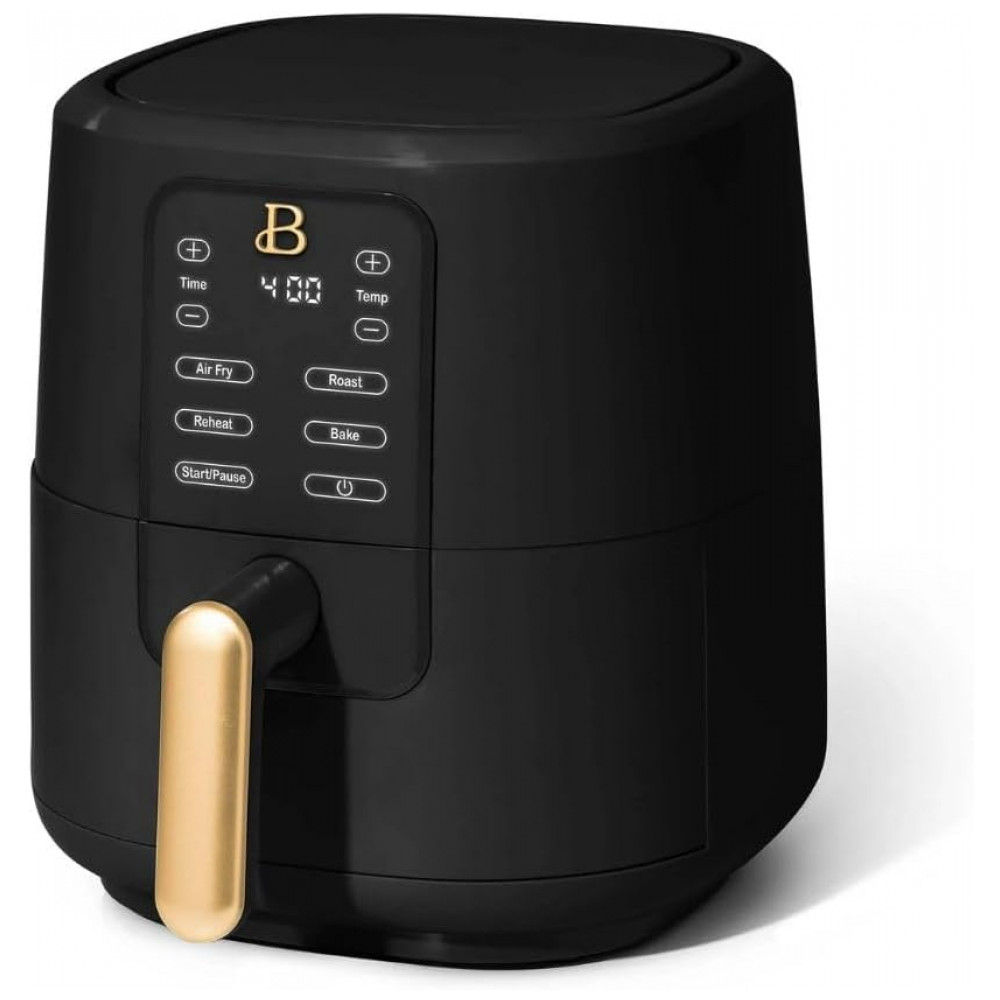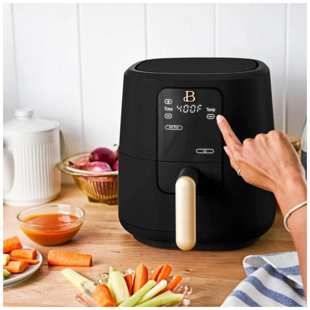 A fritadeira elétrica sem óleo Beautiful 3L TurboCrisp foi desenvolvida para preparo de porções para até 4 pessoas em um cesto com capacidade de 3 litros, combinando fluxo de ar quente de alta velocidade com resistência de 1200W em um corpo compacto na cor preta black sesame. O painel digital com display acionado por toque oferece 4 funções pré-programadas (Air Fry, Bake, Roast e Reheat), além de ajuste manual de tempo e temperatura em uma faixa aproximada de 90 °C a 204 °C, permitindo adaptar o preparo a diferentes tipos de alimentos.
