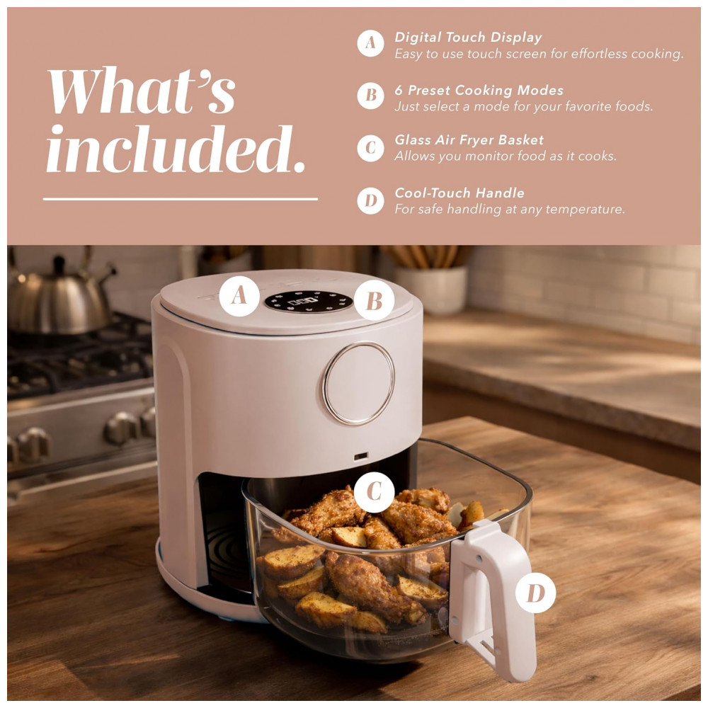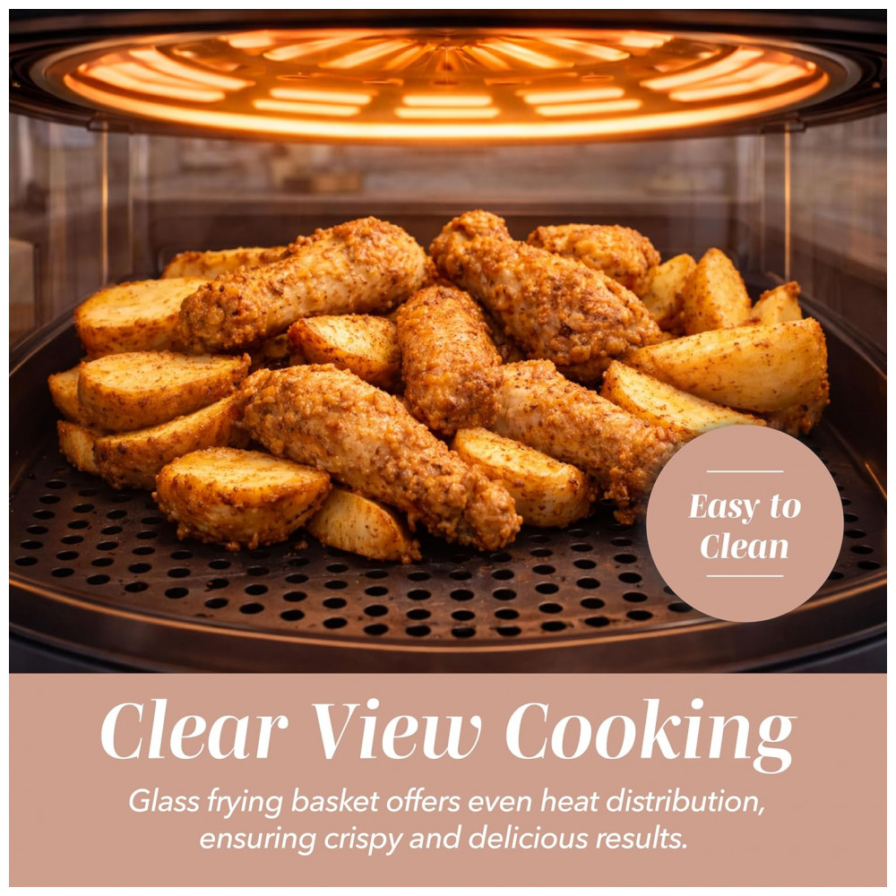A cesta de fritura em vidro possibilita visualização total do alimento durante o preparo e favorece distribuição uniforme de calor. O material em vidro é compatível com lava-louças, facilitando a limpeza após o uso. O painel digital com comandos por toque integra 6 programas pré-configurados que ajustam automaticamente tempo e temperatura para diferentes tipos de receitas.