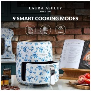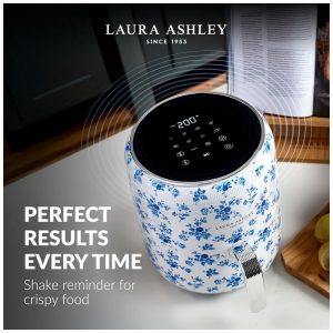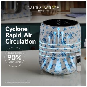A fritadeira elétrica air fryer digital Laura Ashley China Rose possui capacidade de 4,5 litros, indicada para assar, fritar com pouco óleo, reaquecer e desidratar alimentos no uso doméstico. O equipamento utiliza tecnologia de circulação rápida de ar quente para preparar alimentos com redução significativa de óleo em comparação ao fritamento por imersão, mantendo estrutura compacta para bancadas menores.