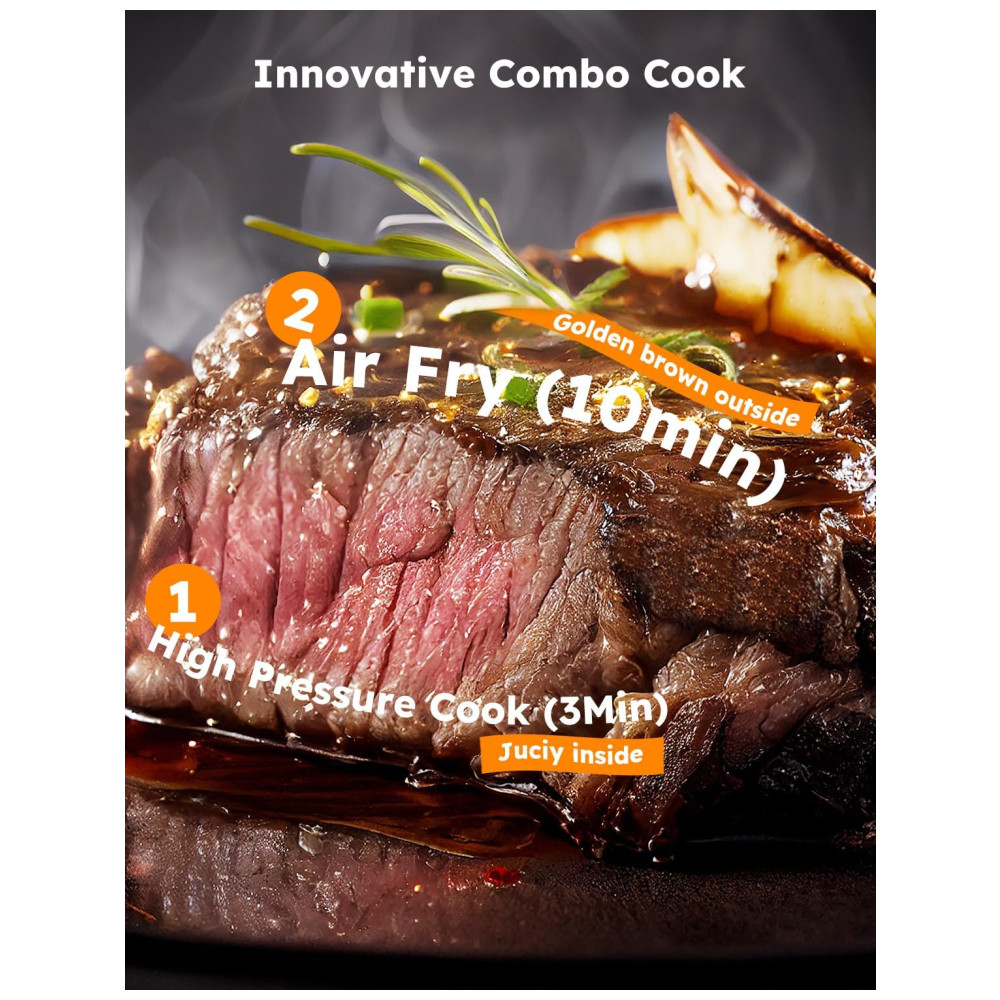 Recursos Especiais: Fácil de limpar, operar e armazenar, 3 configurações de selagem, 5 estágios de cozimento, 10 acessórios, 300 predefinições, 240 slots de memória, 15+ recursos de segurança, cozinha 70% mais rápido, 101% mais macio, 90% menos óleo, desligamento automático, 2 tampas removíveis (panela de pressão e fritadeira a ar), temporizador de 24 horas e função manter aquecido, cozimento combinado
