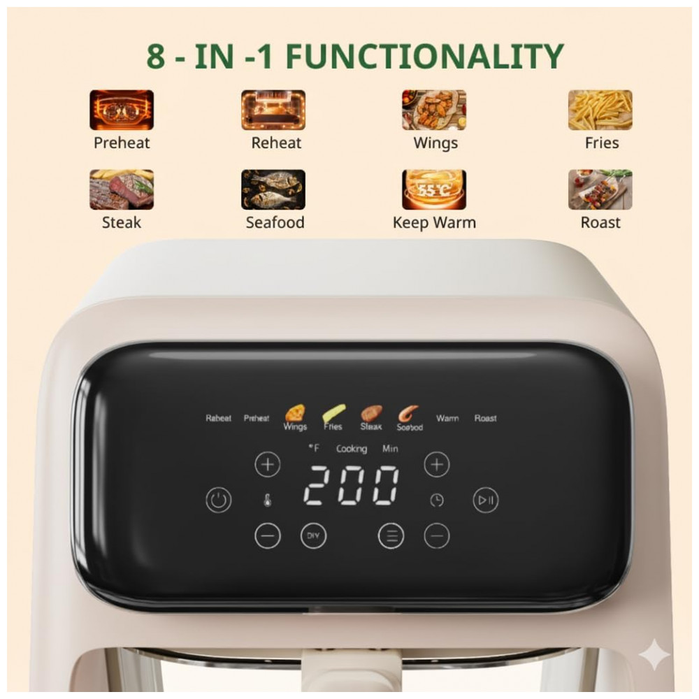 O equipamento conta com 8 programas automáticos configurados para preparos como batatas fritas, frango, carne, frutos do mar e assados, além de modo de ajuste manual de tempo e temperatura. O painel frontal sensível ao toque exibe tempo e temperatura selecionados, e a estrutura inclui base estável, alça de manuseio e componentes removíveis compatíveis com lava-louças.