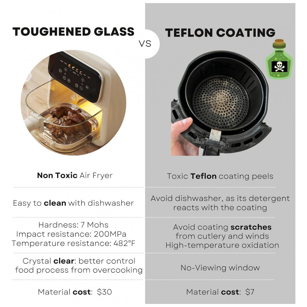 A fritadeira de ar em vidro TempWare foi projetada para preparo de alimentos com circulação de ar quente em cuba de vidro borossilicato, sem revestimento antiaderente aplicado. O sistema de aquecimento de 1200W trabalha com controle eletrônico de temperatura ajustável até aproximadamente 204°C, permitindo assar, grelhar, reaquecer, desidratar e fritar com baixo uso de óleo.