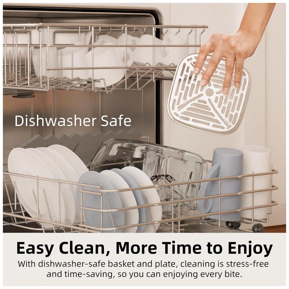 A tigela de vidro, com capacidade aproximada de 4,0 litros, possui paredes espessas e superfície interna lisa, oferecendo maior resistência a choque térmico e menor retenção de odores. A grade interna em aço inoxidável com apoios em silicone eleva o alimento para melhorar a circulação de ar e favorecer o douramento uniforme.