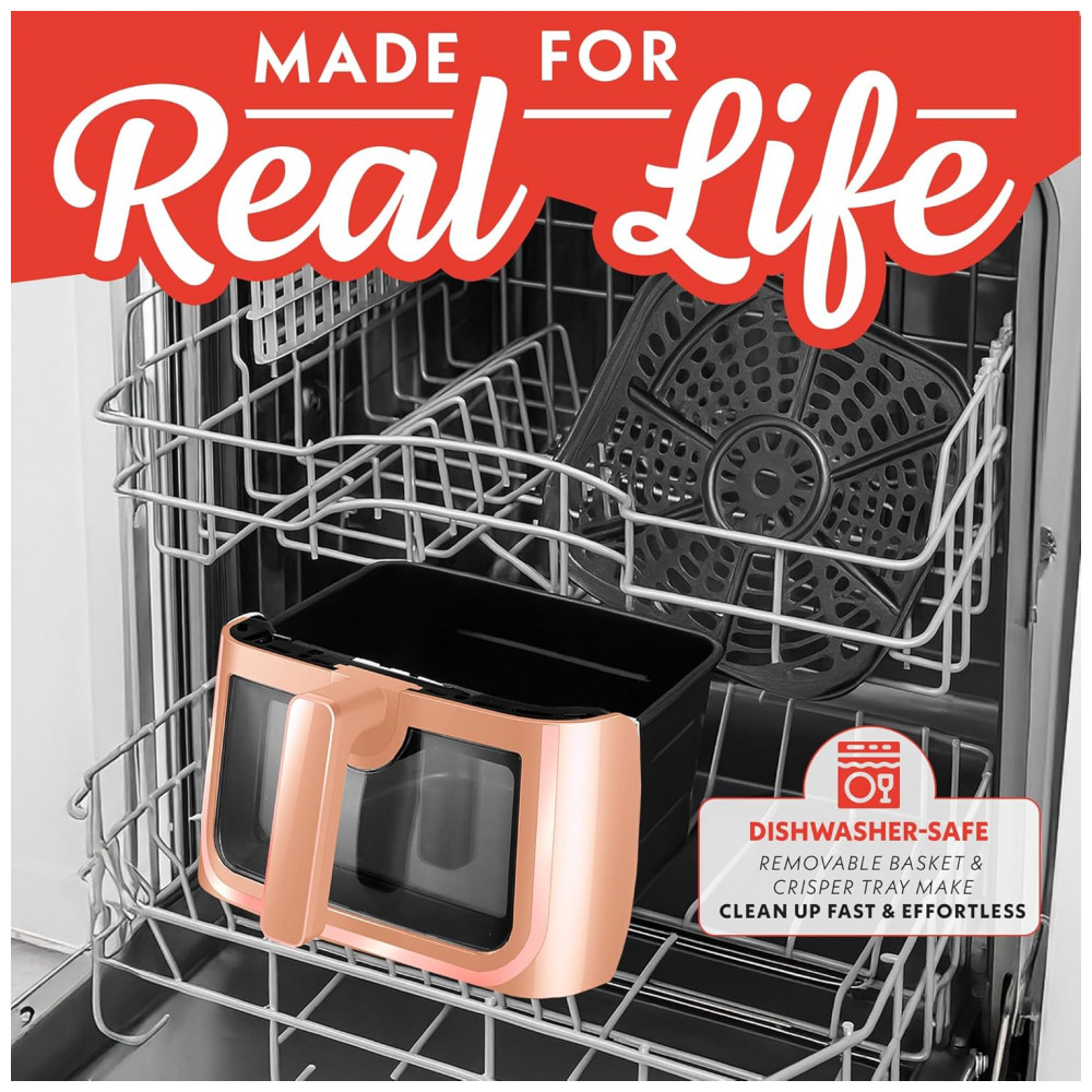 A cuba conta com janela frontal ampliada e iluminação interna, permitindo visualizar o alimento durante o preparo sem a necessidade de abrir o cesto. O painel digital com comandos por toque oferece 8 programas de um toque: Air Fry, Bake, Roast, Broil, Dehydrate, Reheat, Keep Warm e Proof, ajustando automaticamente tempo e temperatura conforme a função selecionada. Recursos de pré-aquecimento e lembretes para virar o alimento contribuem para cocção uniforme do início ao fim.