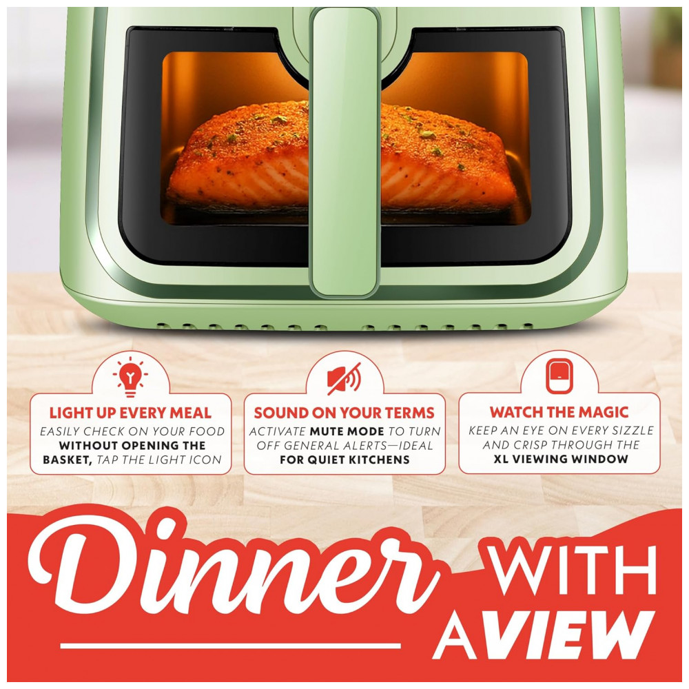 A cuba conta com janela frontal ampliada e iluminação interna, permitindo visualizar o alimento durante o preparo sem a necessidade de abrir o cesto. O painel digital com comandos por toque oferece 8 programas de um toque: Air Fry, Bake, Roast, Broil, Dehydrate, Reheat, Keep Warm e Proof, ajustando automaticamente tempo e temperatura conforme a função selecionada. Recursos de pré-aquecimento e lembretes para virar o alimento contribuem para cocção uniforme do início ao fim.