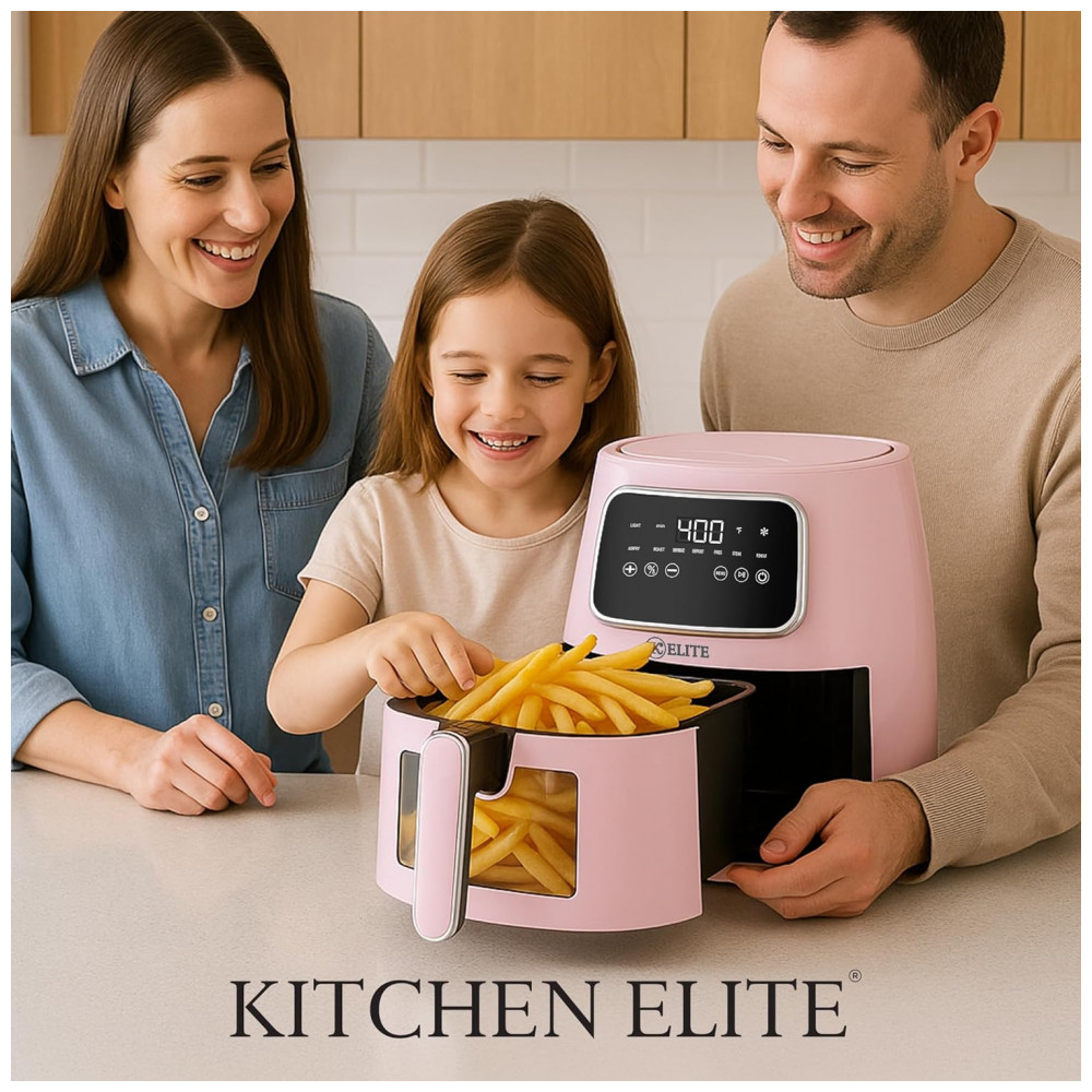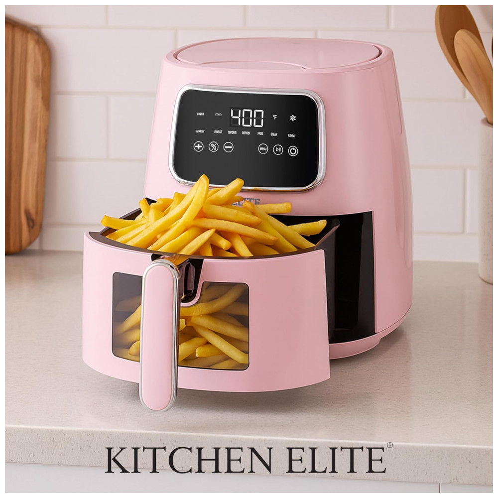 A fritadeira elétrica Kitchen Elite AF550PK é uma air fryer digital de bancada com capacidade de 5,5 litros, indicada para preparar refeições diárias para 2 a 4 pessoas. O cesto comporta porções de batatas fritas, carnes, frango, legumes e lanches diversos em um formato compacto de fácil acomodação na bancada.