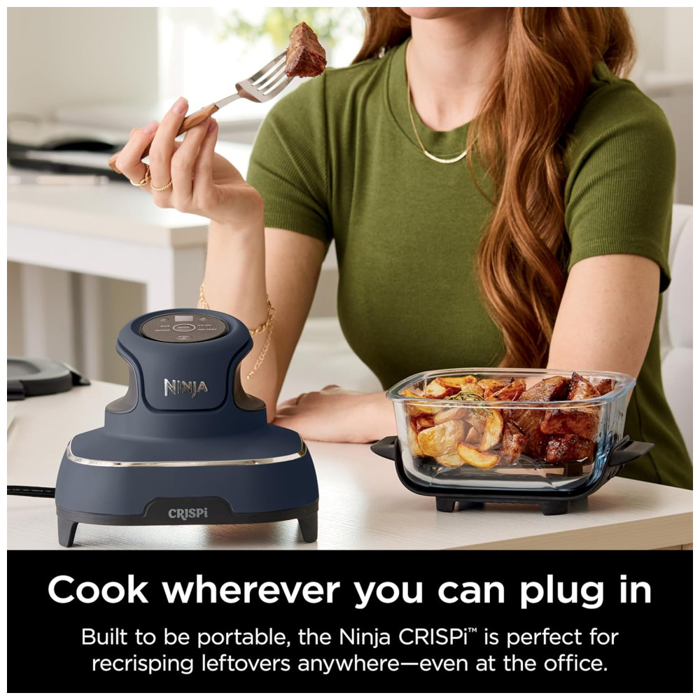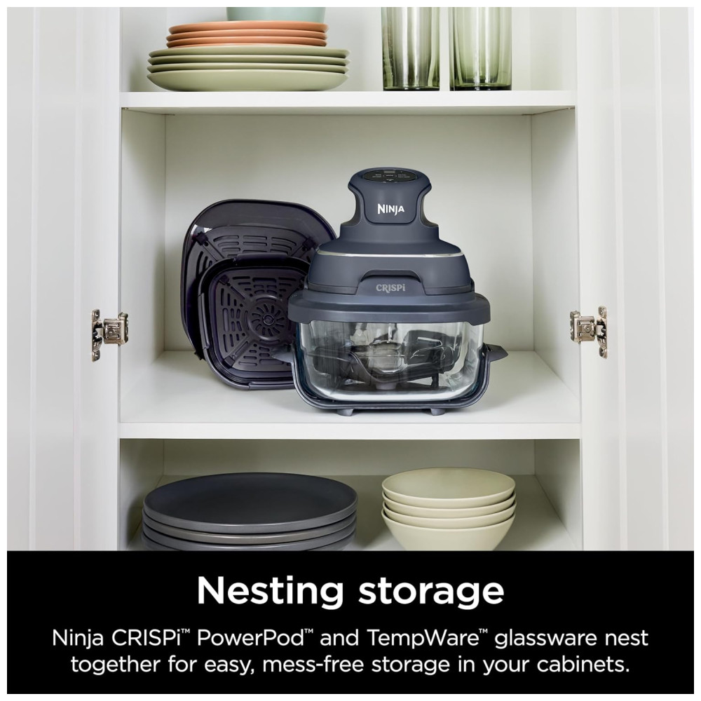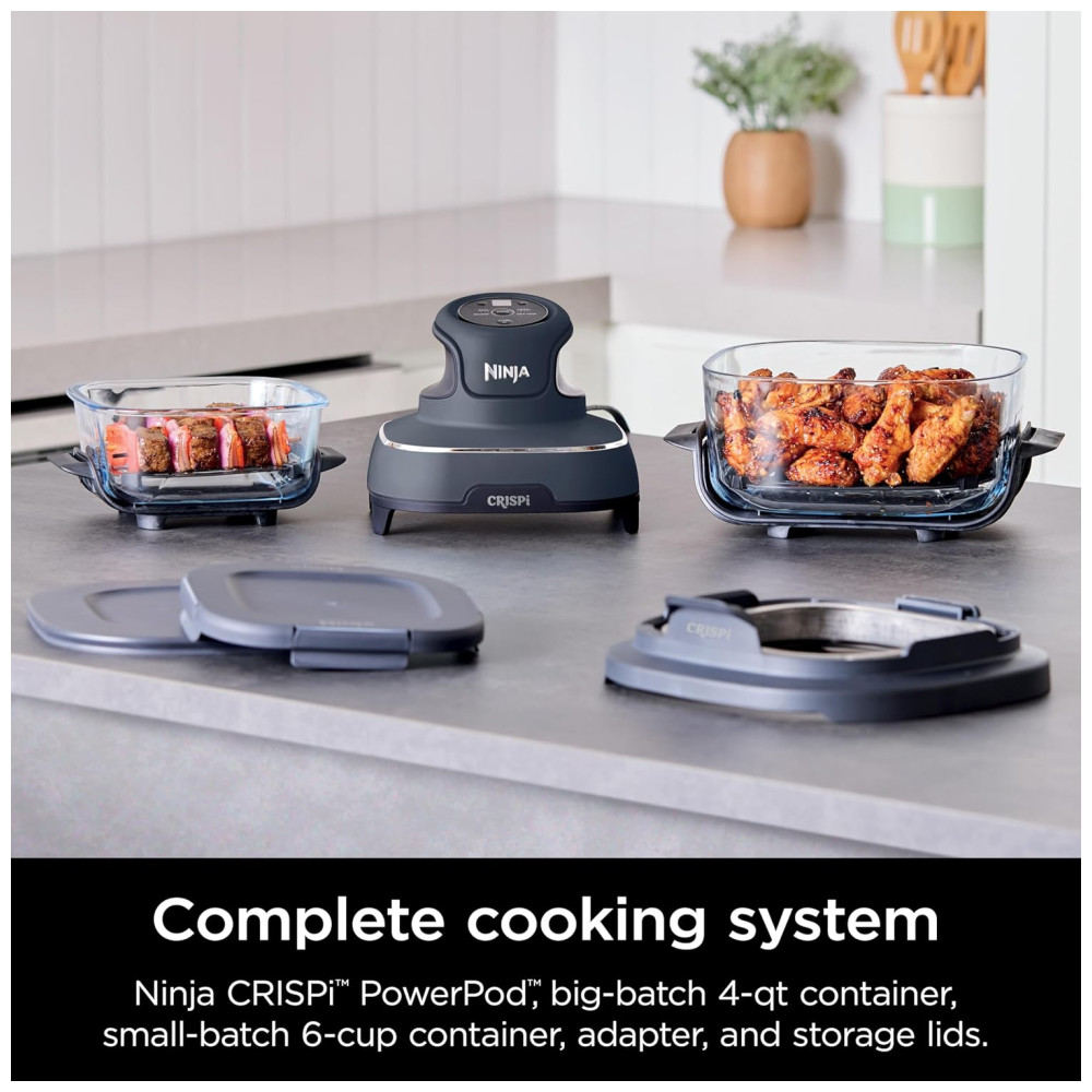 O Ninja Crispi é um sistema de cozimento portátil que oferece a potência de uma fritadeira de ar de tamanho normal em um design compacto. Ele inclui um recipiente TempWare menor, com capacidade para 1.4 litros, e um maior, com capacidade para 3,73 litros. Com o Ninja Crispi, você pode preparar refeições rápidas em apenas 7 minutos, compartilhar lanches crocantes em qualquer lugar ou servir uma multidão. Os utensílios de vidro de borosilicato duráveis suportam mudanças extremas de temperatura, permitindo que você vá diretamente do congelado ao crocante. A limpeza é simples, pois todos os acessórios podem ser lavados na máquina de lavar louça e foram projetados para serem encaixados para fácil armazenamento. O sistema AllinOne inclui o Ninja Crispi PowerPod, recipientes de vidro TempWare de 3,73 litros e 1,4 litros e 2 tampas de armazenamento. O Crispi PowerPod oferece o poder de uma fritadeira de ar de tamanho normal na palma da sua mão. Os recipientes de pequenos e grandes lotes permitem que você cozinhe uma refeição individual em 7 minutos ou acomode 1,81 quilos de frango e vegetais. O vidro de borosilicato de alta qualidade pode suportar mudanças extremas de temperatura de -5 a 232 ºC. O Ninja Crispi oferece funcionalidade 4 em 1 Max Crisp, Assar, Fritar ao Ar e Recrisp. Ele apresenta proteção fixa contra o calor com pés permanentemente resistentes ao calor, permitindo que você coloque o com segurança em granito, laminado, quartzo, bloco de açougueiro, mármore e muito mais. As tampas Snaplock à prova de vazamento garantem que sua refeição não derrame em movimento. O adaptador de recipiente Crispi incluído permite que o Crispi PowerPod seja usado no recipiente maior. O Ninja Crispi é fácil de limpar, pois os recipientes, pratos para vegetais, adaptador e tampas podem ser lavados na máquina de lavar louça.