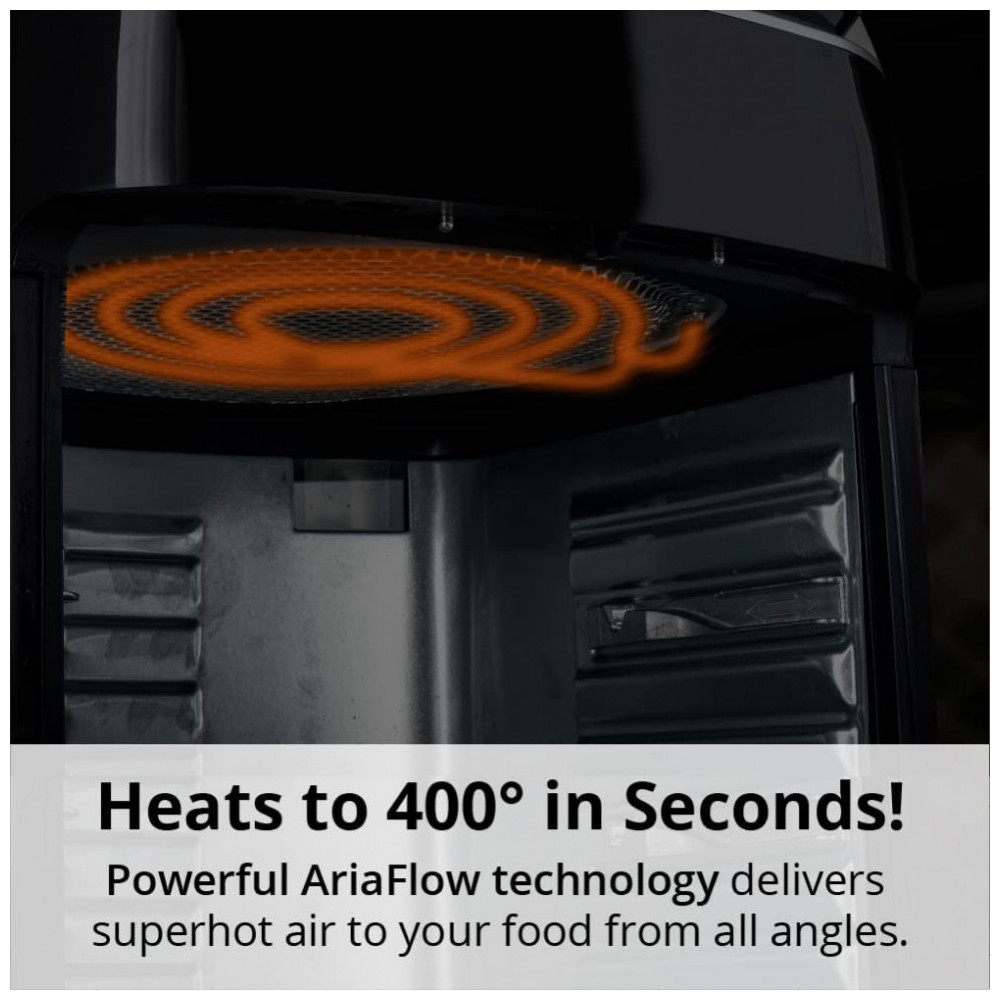 Tecnologia de Aquecimento Uniforme: Inclui um espeto rotativo que gira 360° para cozinhar frangos de forma uniforme, além de um cesto rotativo que mistura seus ingredientes continuamente, utilizando a tecnologia AriaFlow para resultados perfeitos.