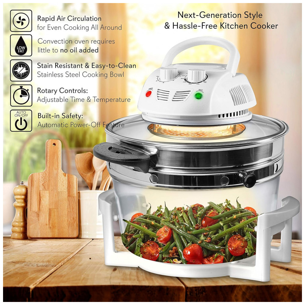 Escolha a fritadeira de ar, convecção infravermelha, com bancada de forno de halogênio em aço inoxidável, 1200W, para preparar refeições rápidas e saudáveis. Disponível em branco, com capacidade de 13 litros.