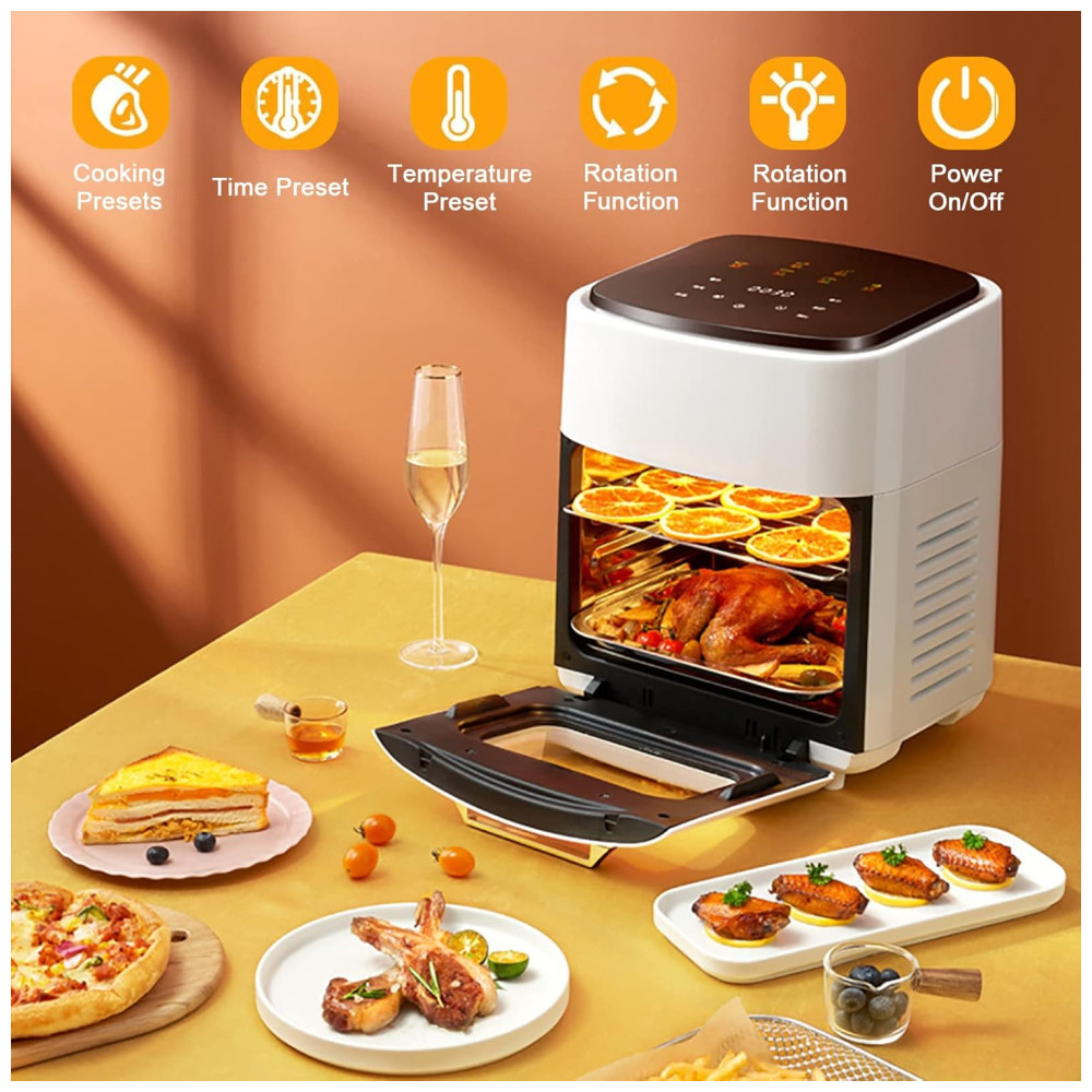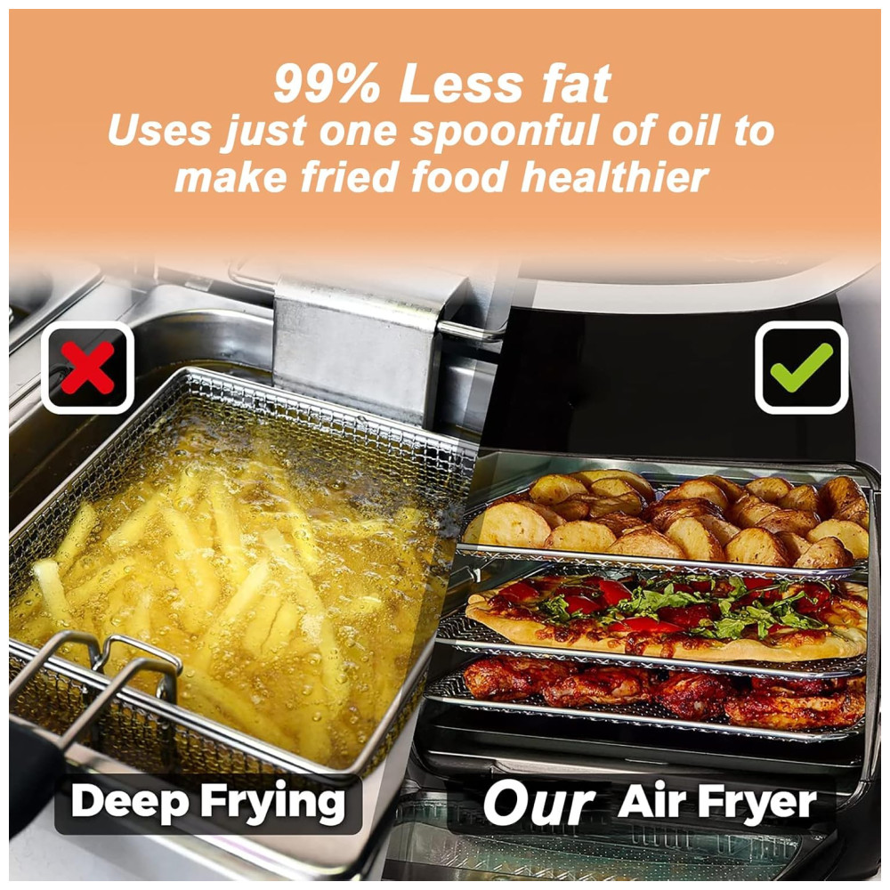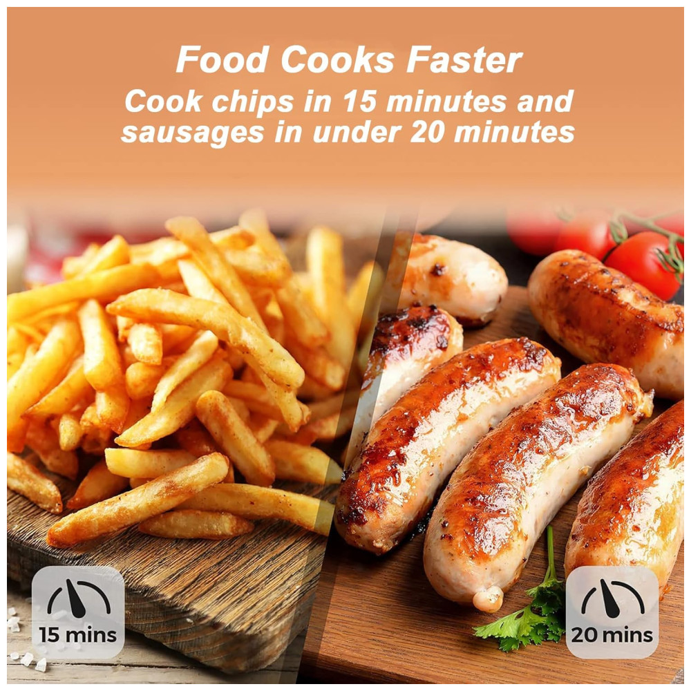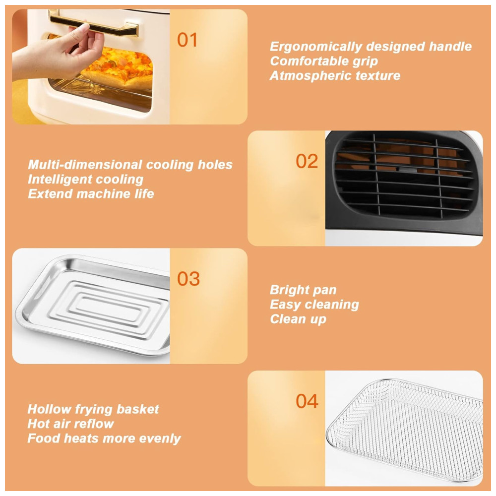 Operação Simples: Os 8 modos são exibidos na tela digital LED touch, permitindo que você selecione qualquer botão para satisfazer seu gosto pessoal. A circulação rápida de ar cria texturas mais crocantes nas suas refeições favoritas, 30% mais rápido do que um forno convencional.