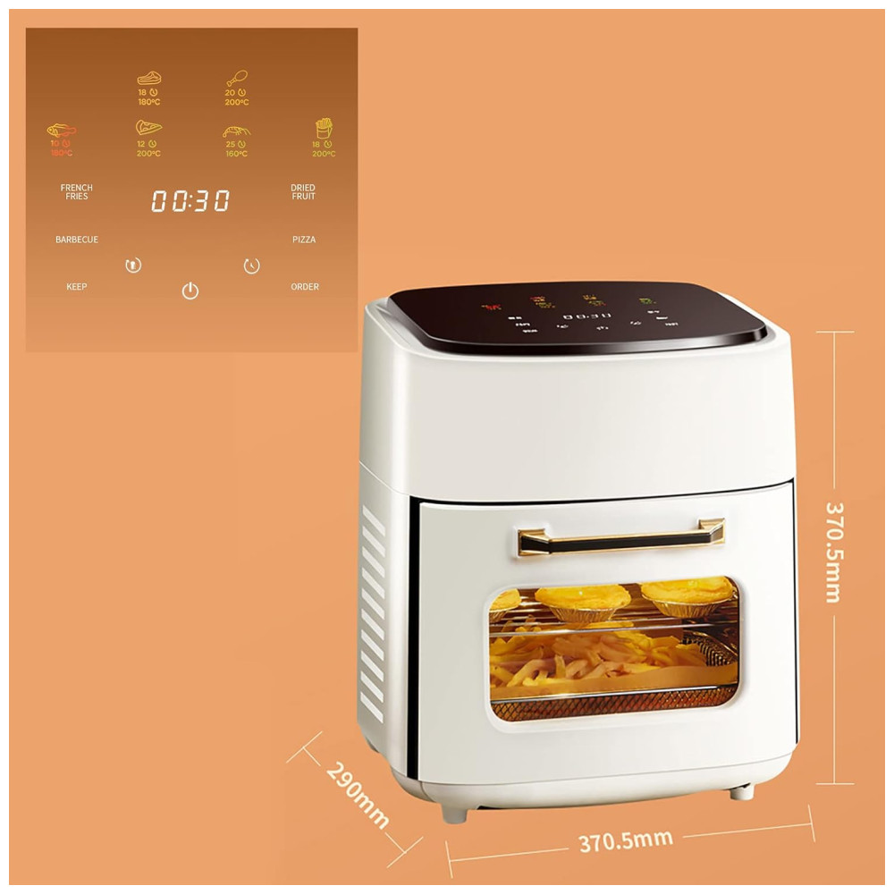 Tudo em um só aparelho: Esta air fryer tem capacidade de 15 litros e potência de 1400W, equipada com 8 modos de uso: Bife, Frango, Frutos do Mar, Camarão, Bacon, Alimentos Congelados, Batatas Fritas, Vegetais, Vegetais de Raiz, Pão e Sobremesas. Isso significa que esta air fryer permite fritar, assar, grelhar, tostar, desidratar e usar como churrasqueira. A janela de vidro transparente ajuda a monitorar todo o processo de cozimento.
