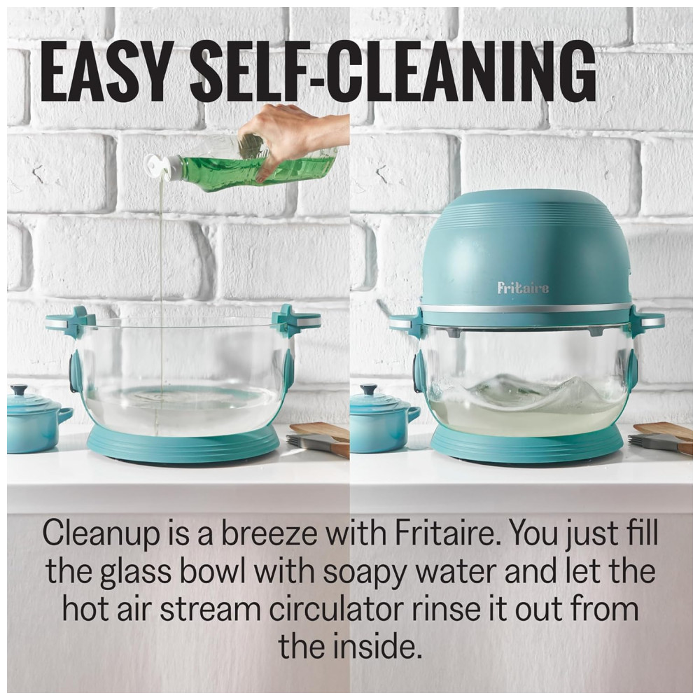 AUTO LIMPEZA FÁCIL: A limpeza é muito fácil com Fritaire. Basta encher a tigela de vidro com água e sabão e deixar o circulador de ar quente enxaguá la por dentro.