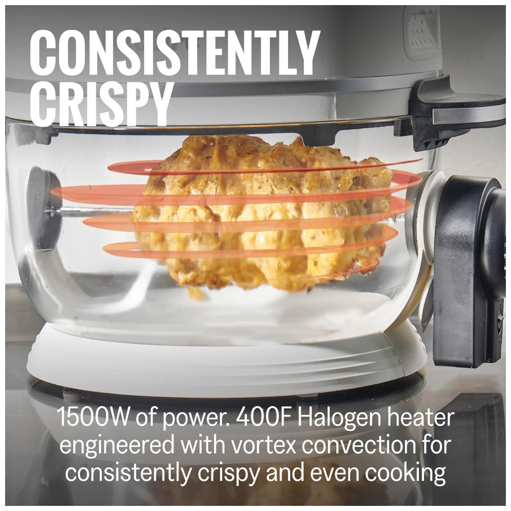 CONVECÇÃO PODEROSA: 1500W de potência. Aquecedor de halogênio 200C projetado com convecção de vórtice para cozimento consistentemente crocante e uniforme.