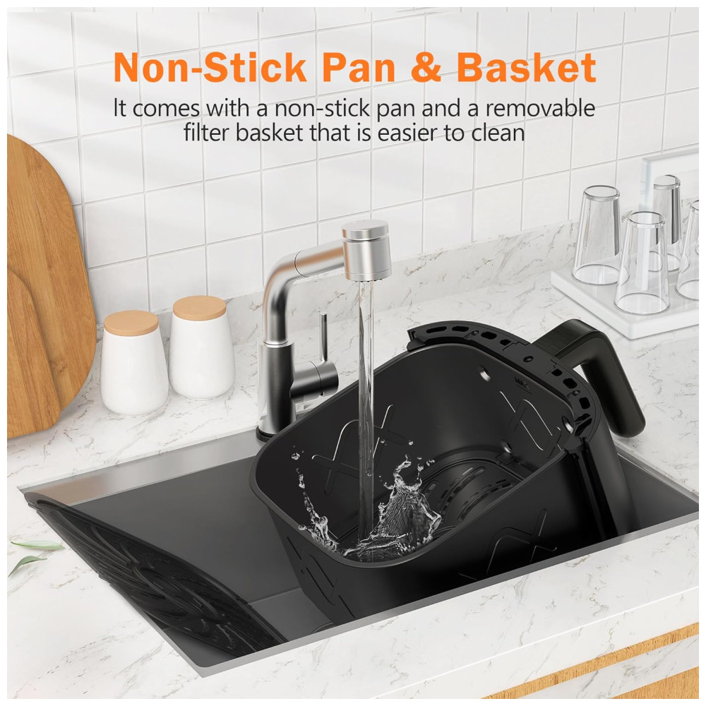 Durável e Fácil de Limpar: Fabricada com material altamente resistente, esta air fryer vem com uma cesta removível e uma grelha antiaderente, que são fáceis de lavar após o uso. O painel de controle digital é simples de operar – comece a cozinhar com apenas um toque de botão. É eficiente e conveniente para o dia a dia.