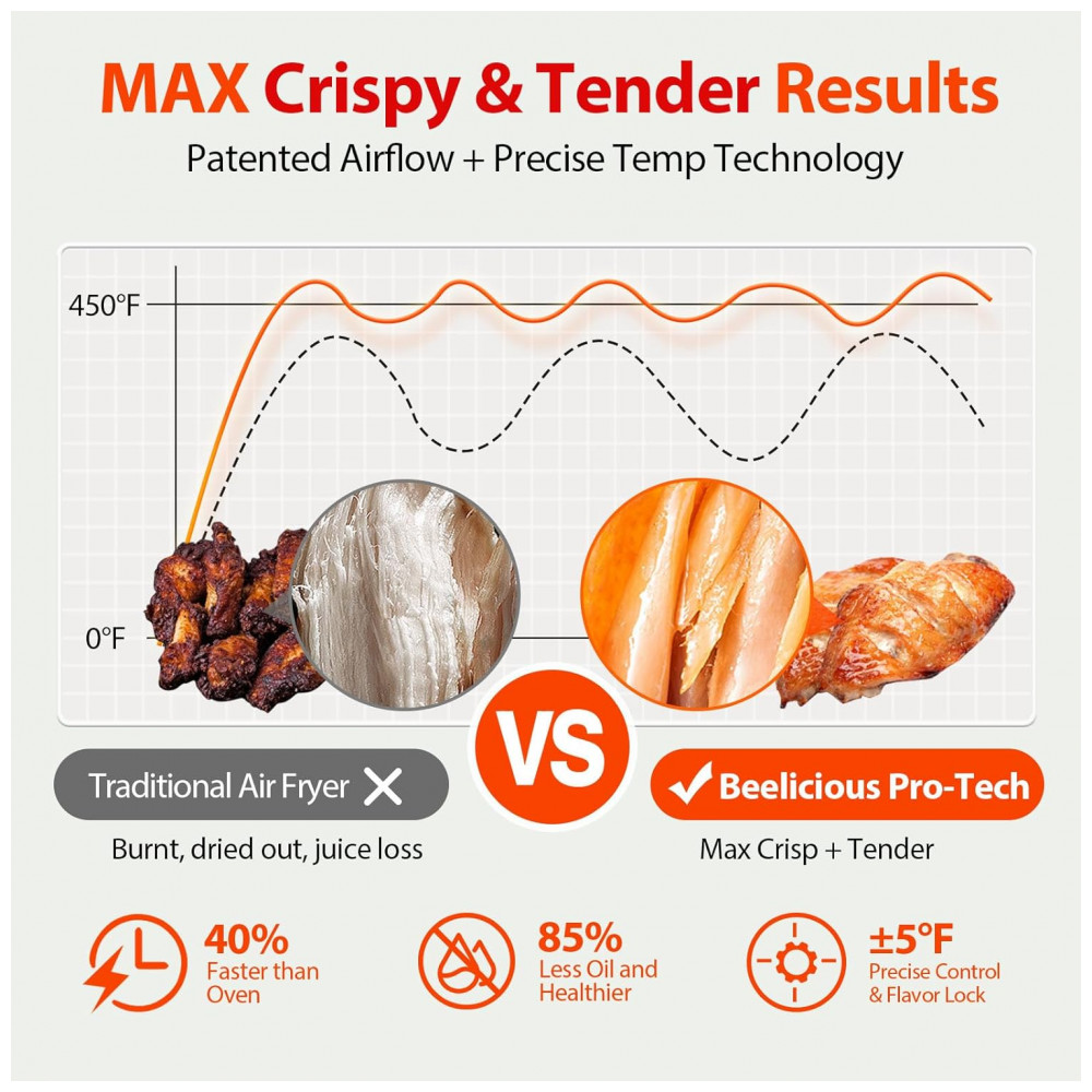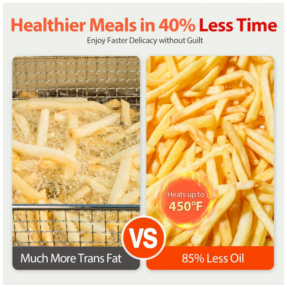 Refeição Mais Saudável em Minutos: Com temperaturas líderes do setor de até 232°C e design exclusivo de câmara de metal, esta fritadeira aquece 40% mais rápido do que um forno tradicional, e utiliza até 85%-90% menos óleo, garantindo resultados saudáveis todas as vezes!