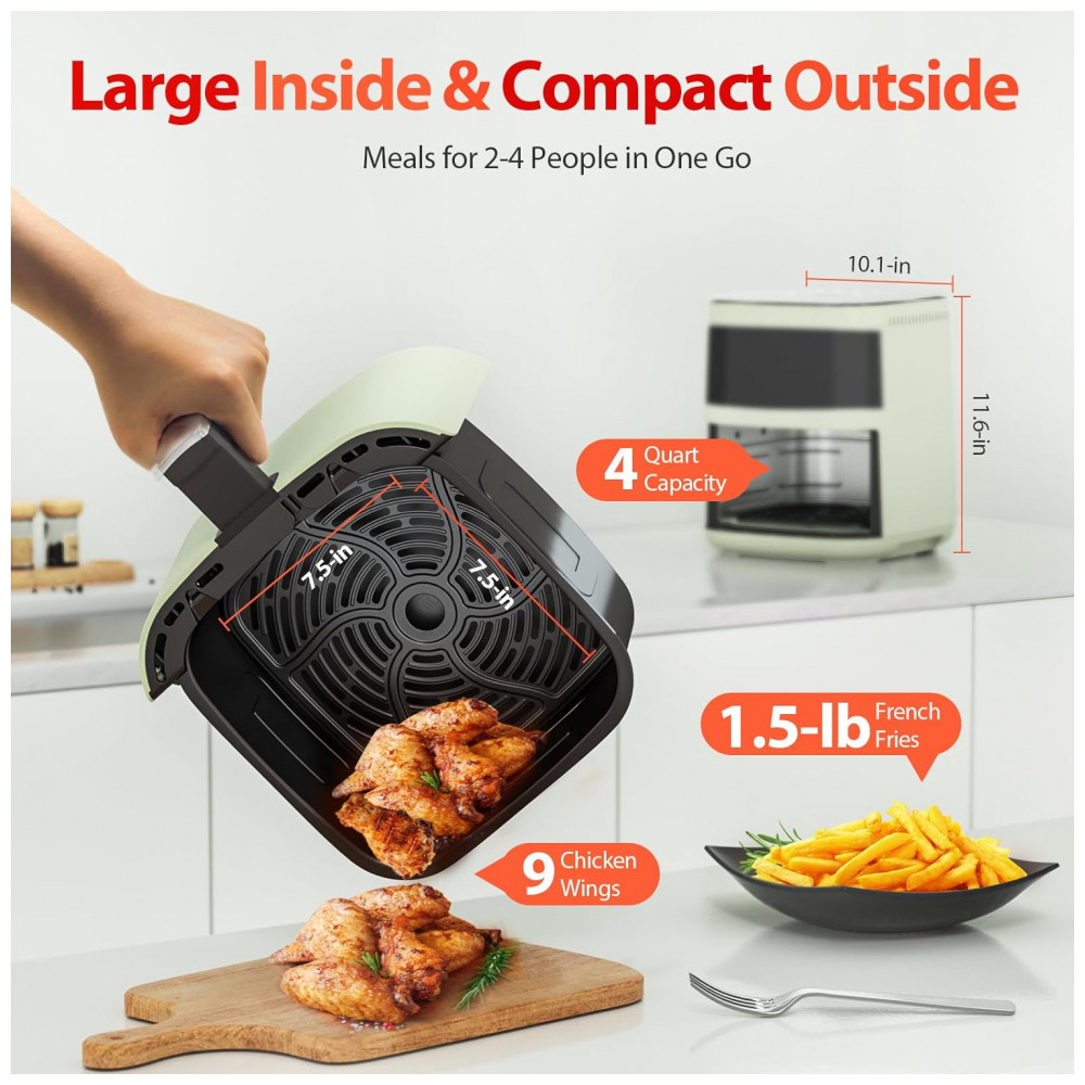 Grande Capacidade e Tamanho Compacto: 3,7 L de espaço de cozimento, acomodando 680 gramas de batatas fritas ou 8-10 asas de frango, suficiente para 1-3 pessoas, com um tamanho compacto que ocupa pouco espaço na sua bancada.