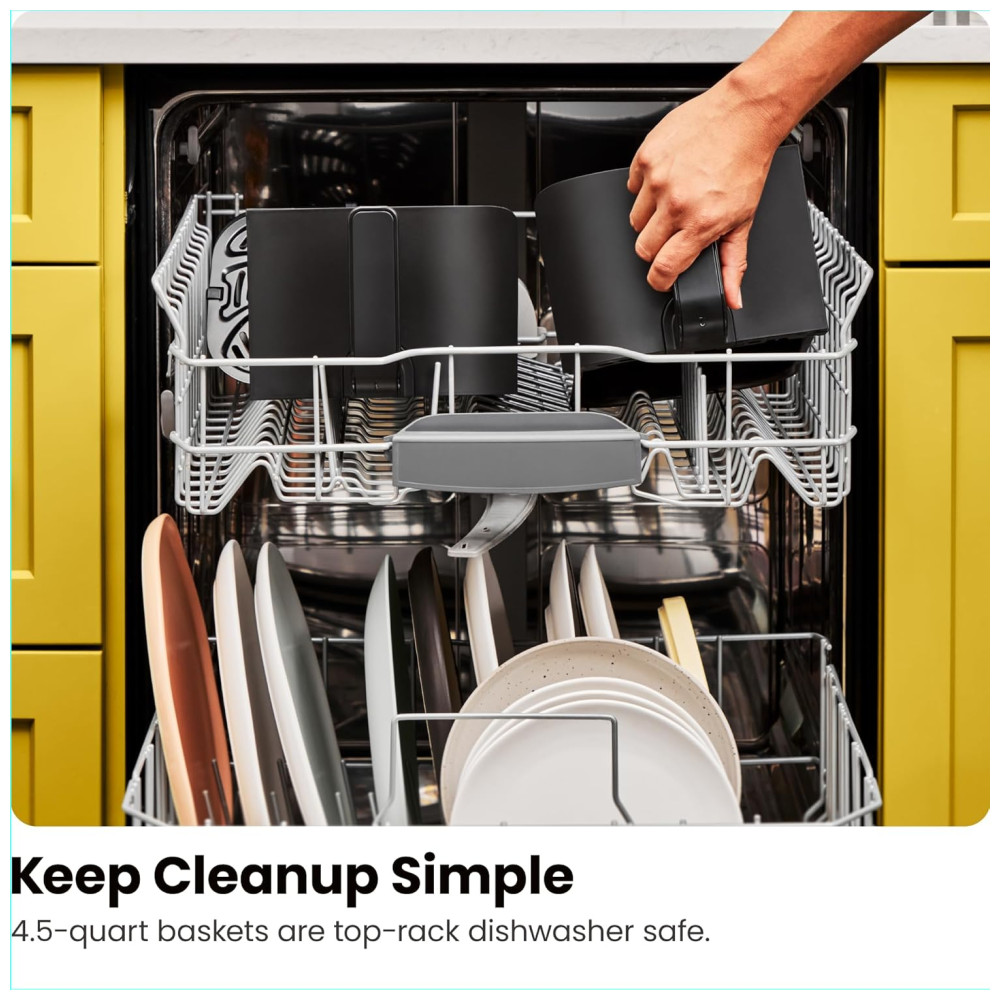 LIMPEZA SEM PREOCUPAÇÕES: Esta airfryer é o pacote completo—espaçosa e incrivelmente elegante. O exterior preto fosco exibe-se lindamente em sua bancada, mas também é extremamente simples de guardar. Quando terminar de cozinhar, basta limpar o exterior com um pano úmido. Todos os acessórios são seguros para lava-louças, e as cestas antiaderentes são incrivelmente fáceis de limpar.
