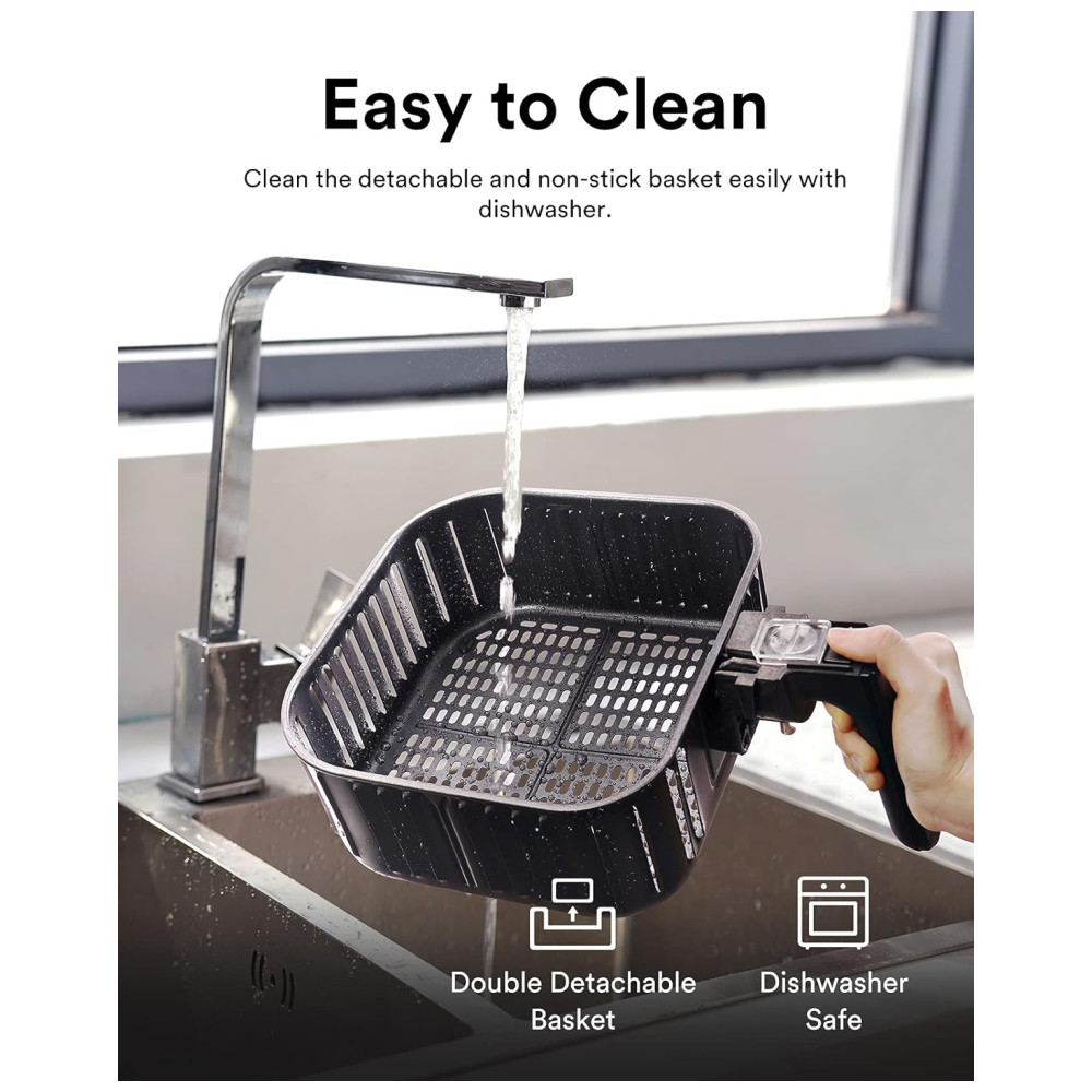 Com uma capacidade de 5.4 litros, esta fritadeira pode acomodar um frango inteiro de 2.3 a 2.7 kg, atendendo facilmente a refeições para 3 a 6 pessoas. A grande cesta garante que você possa preparar porções generosas para sua família.