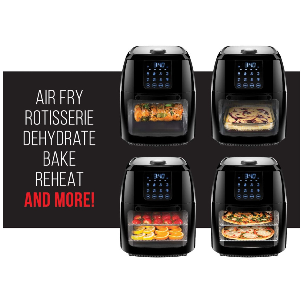 O ÚNICO PRODUTO QUE VOCÊ PRECISA Este produto versátil funciona como uma fritadeira de ar, espeto rotativo e desidratador, perfeito para quase todas as tarefas de cozimento. Faça batatas fritas melhores para você, que sejam tão crocantes e saborosas, assar um frango inteiro ou desidratar os restos de abacaxi que você pretende comer.
