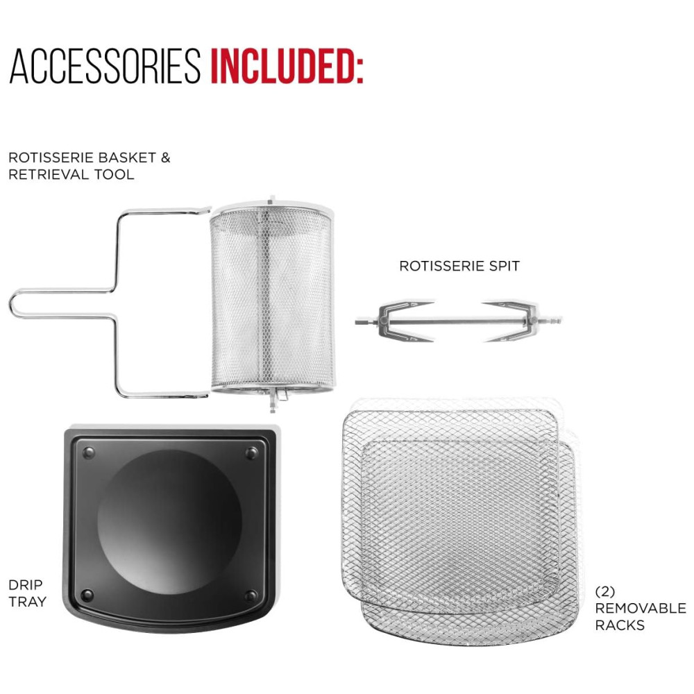 ACESSÓRIOS CONVENIENTES A iluminação interior permite que você observe facilmente a comida enquanto ela cozinha. Os acessórios incluem 2 racks de fluxo de ar, espeto rotativo e garfos, cesta giratória , ferramenta de recuperação e bandeja coletora. A bandeja coletora removível e as peças próprias para lava louças tornam a limpeza muito fácil.