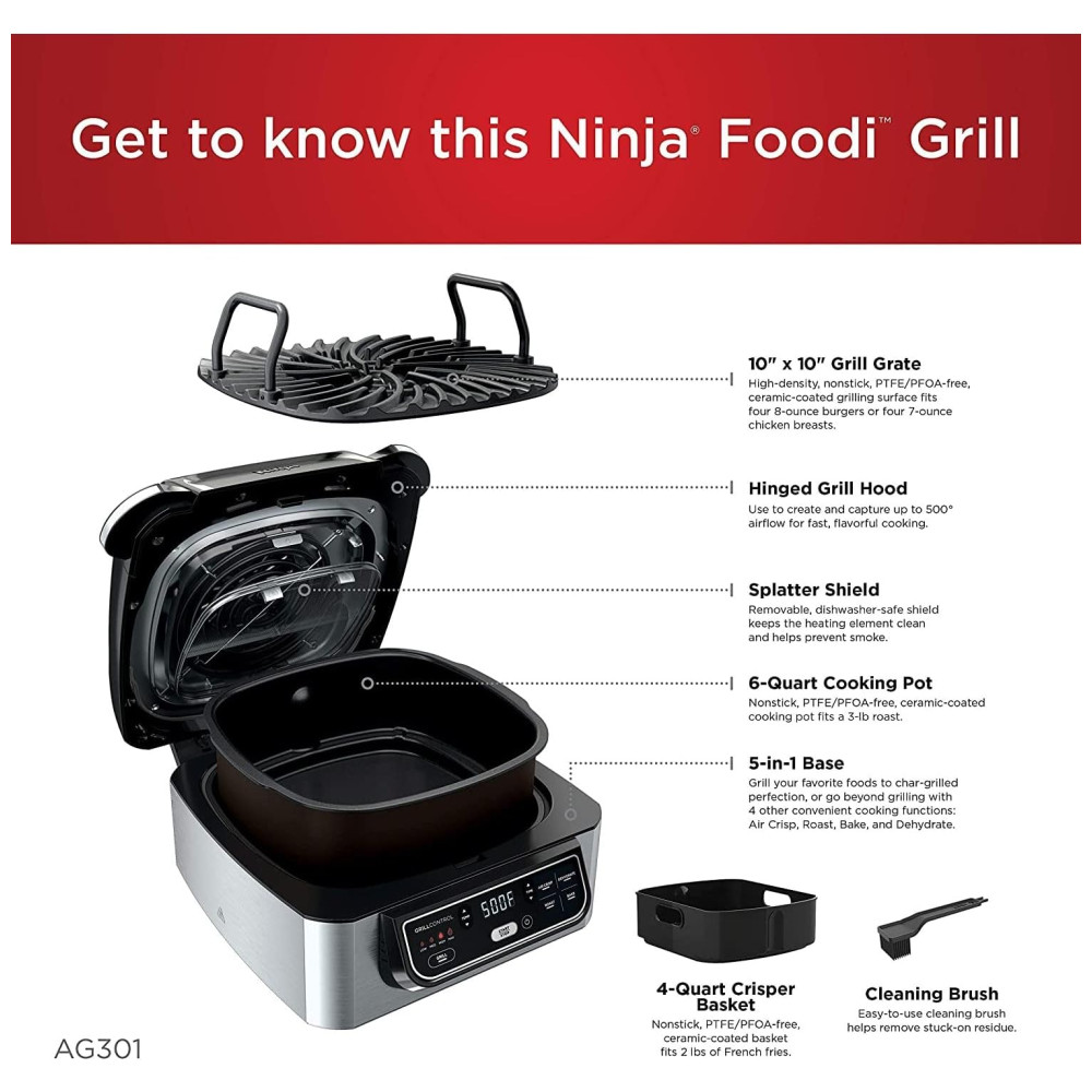 O Que Está Incluído: Ninja Foodi Grill, Grelha de 25,4 cm x 25,4 cm, Cesto Crocante de 4 litros, Panela de Cozimento de 6 litros, Livro de Receitas com 15 Receitas Criadas por Chefes & Escova de Limpeza. Desconecte a unidade da tomada antes da limpeza. Mantenha o capô aberto após remover a comida para que a unidade esfrie mais rapidamente.