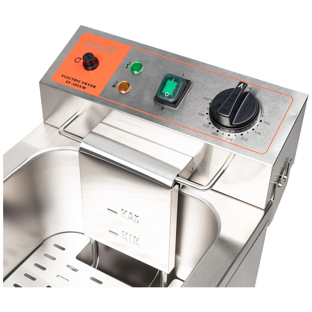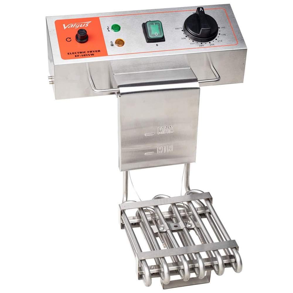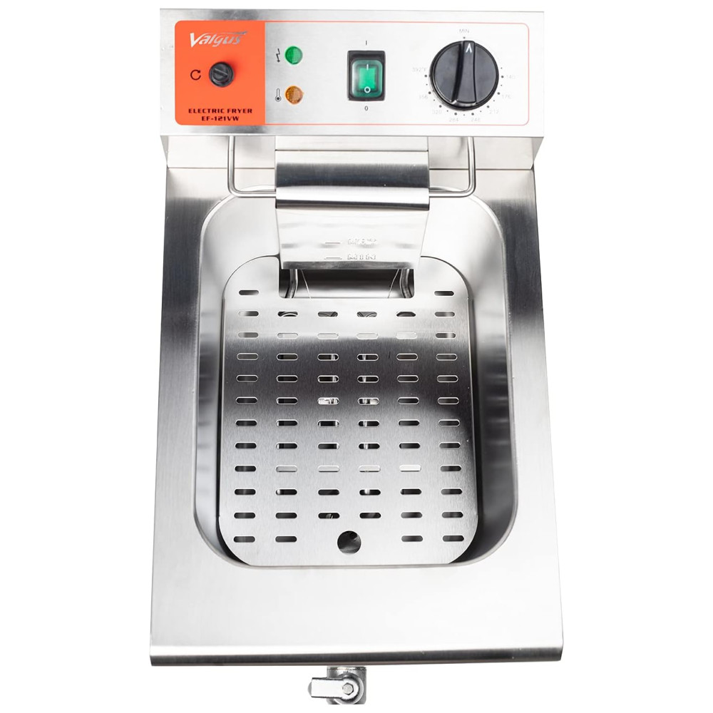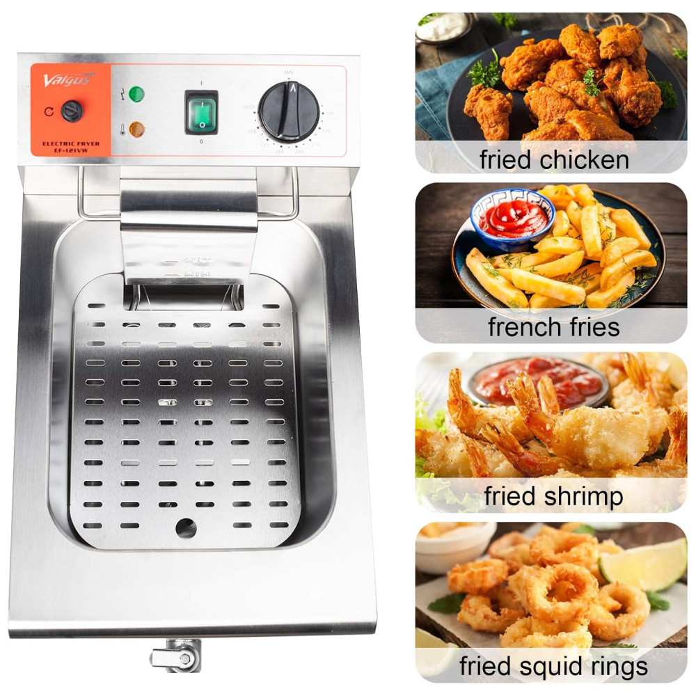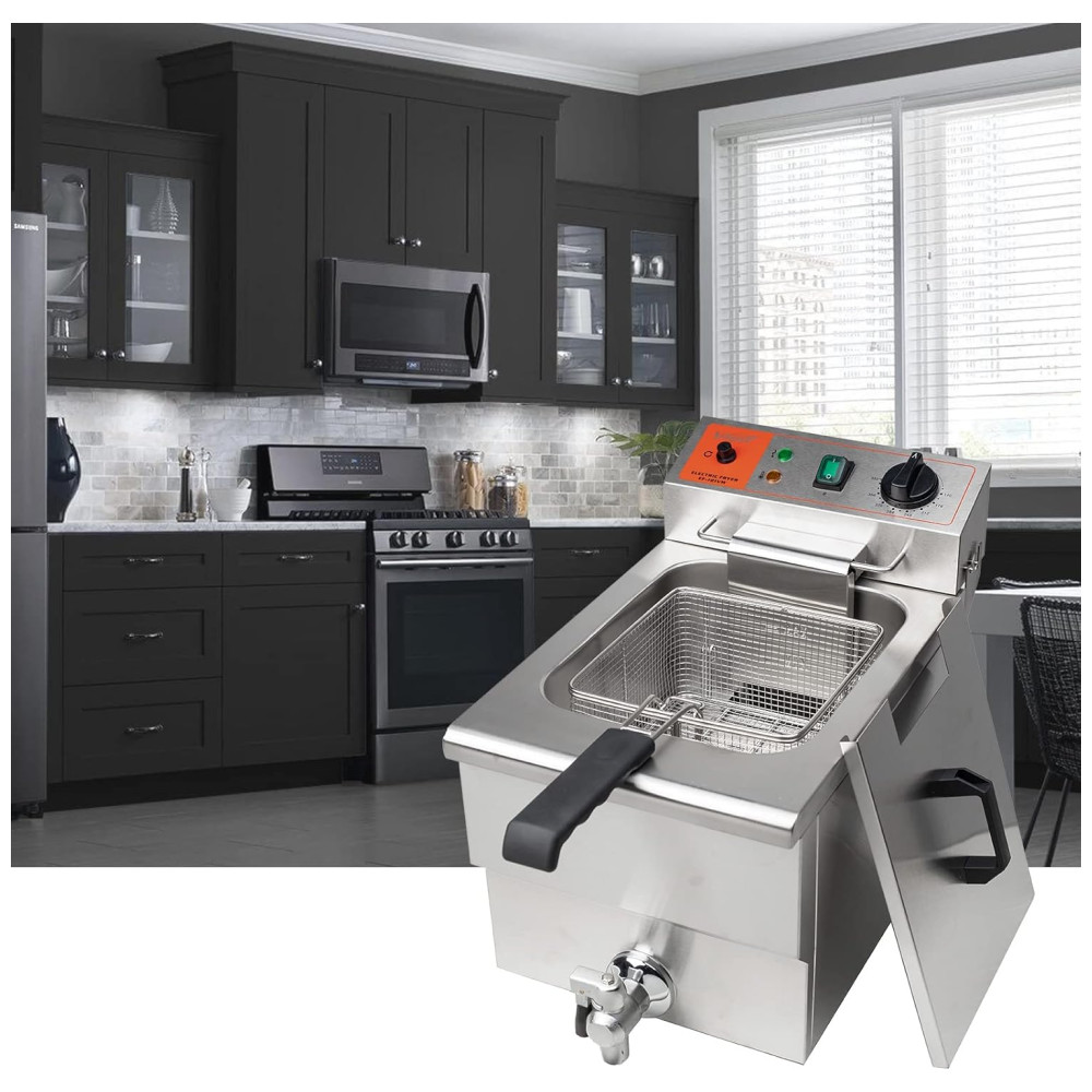 AQUECIMENTO RÁPIDO A fritadeira elétrica de 120V é construída com carroceria de máquina de galvanoplastia premium, cesta de aço inoxidável, torneira e tubo de aquecimento atualizado. Controle de calor ajustável 50 a 200 C. O tubo de aquecimento distribui calor uniforme e rápido.