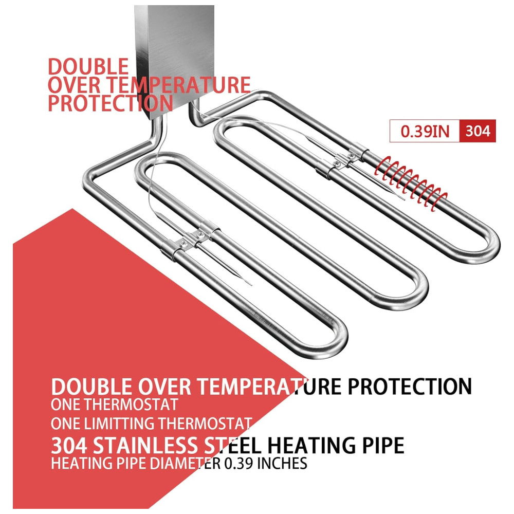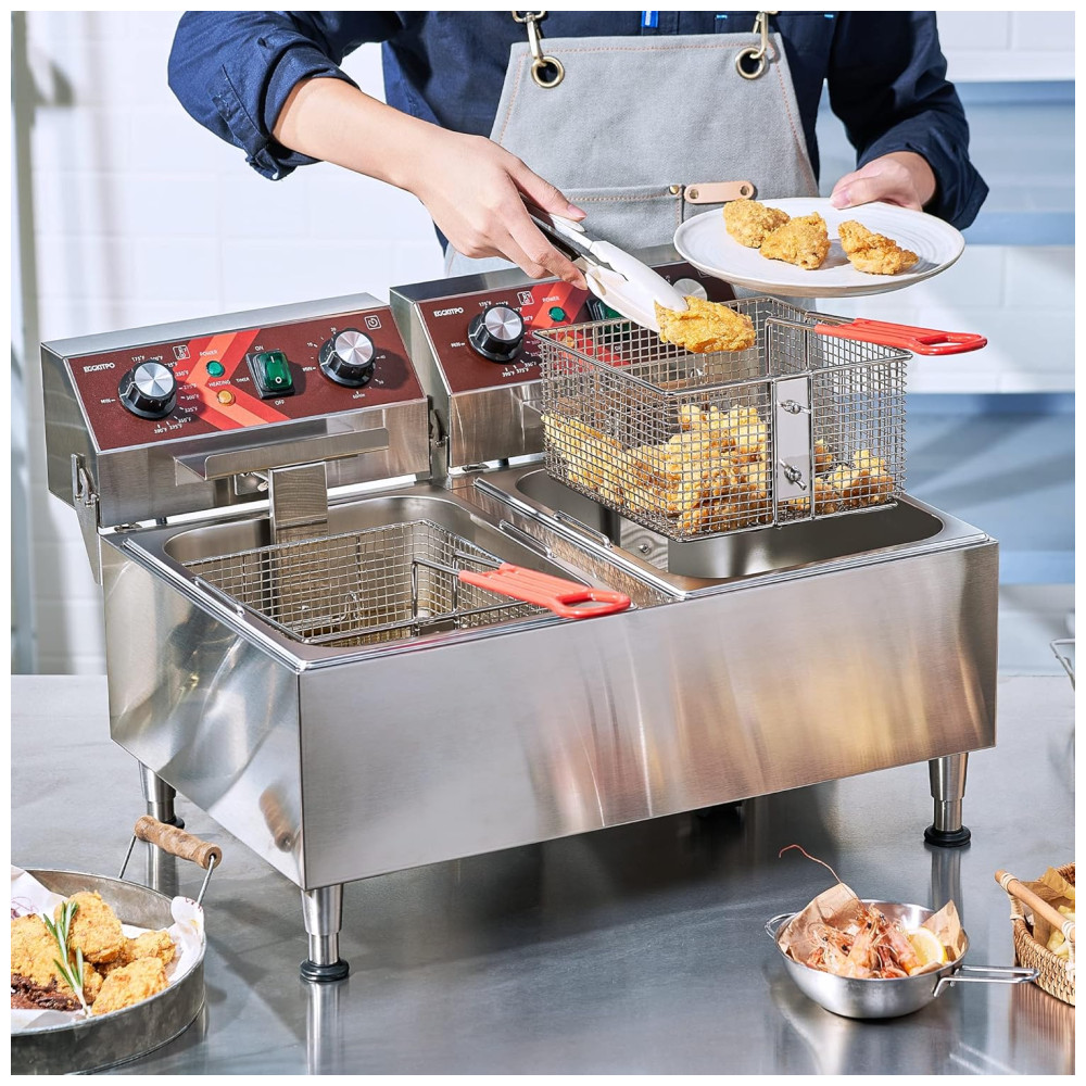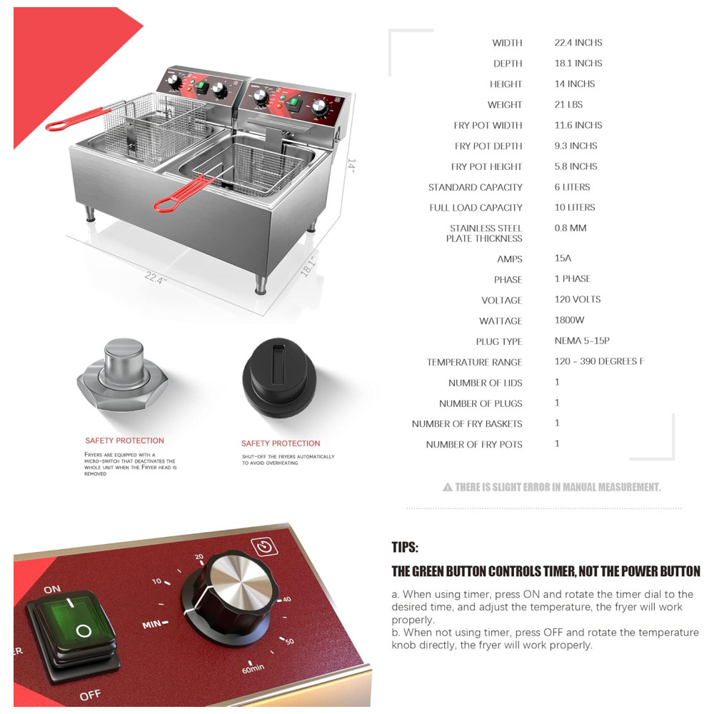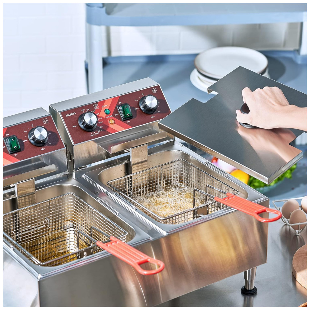 AQUECIMENTO RÁPIDO – Esta fritadeira elétrica de bancada com tanque duplo e potência total de 3600W (1800W em cada lado) oferece alta eficiência de aquecimento para cozinhar de forma mais rápida. Projetada para atender às exigências de uso intenso em lanchonetes, quiosques ou stands de concessão. Perfeita para fritar batatas, peixes, tiras de frango, donuts, frituras, anéis de cebola, camarões, batatas fritas e muito mais.