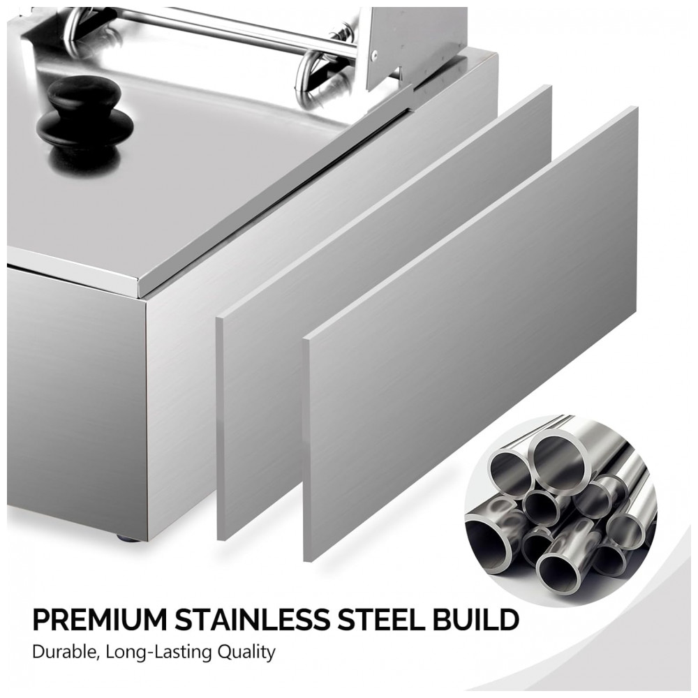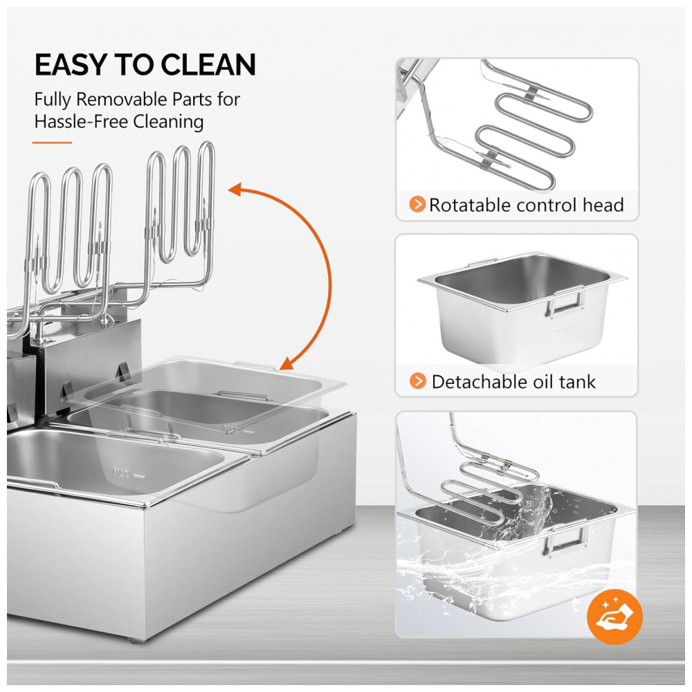 Durabilidade e Fácil Limpeza: A fritadeira de bancada, feita de aço inoxidável de alta resistência, possui uma construção sólida. O tanque espessado é durável e pode ser removido para facilitar a limpeza. Além disso, o tanque de óleo é projetado com alças, tornando mais conveniente sua remoção.