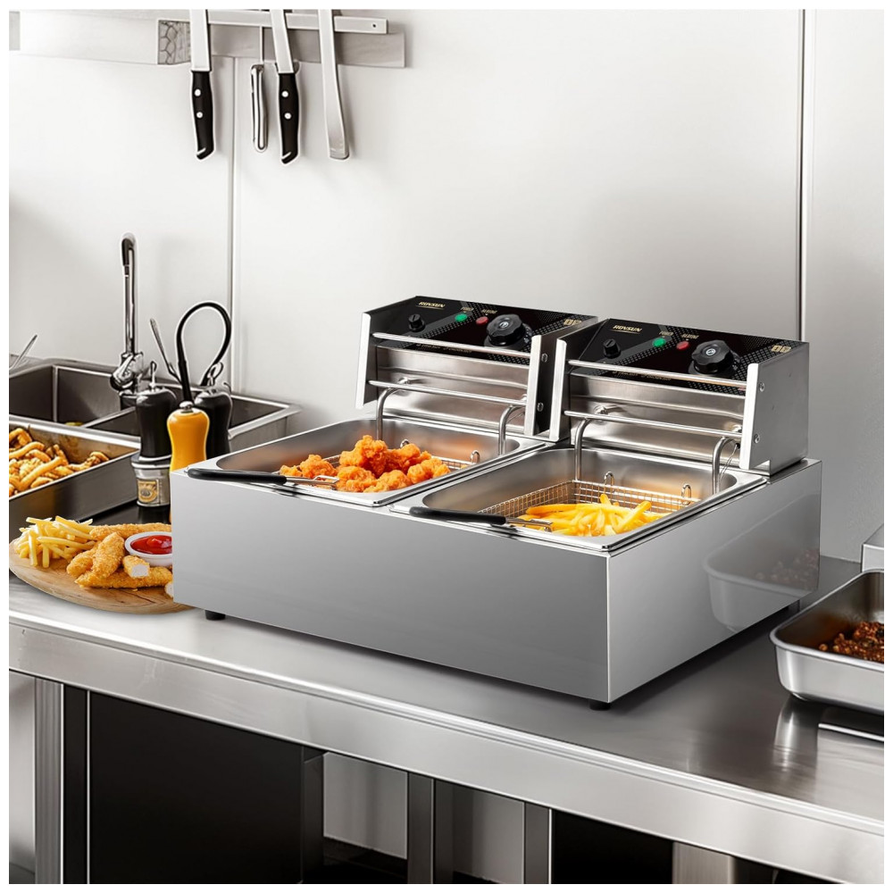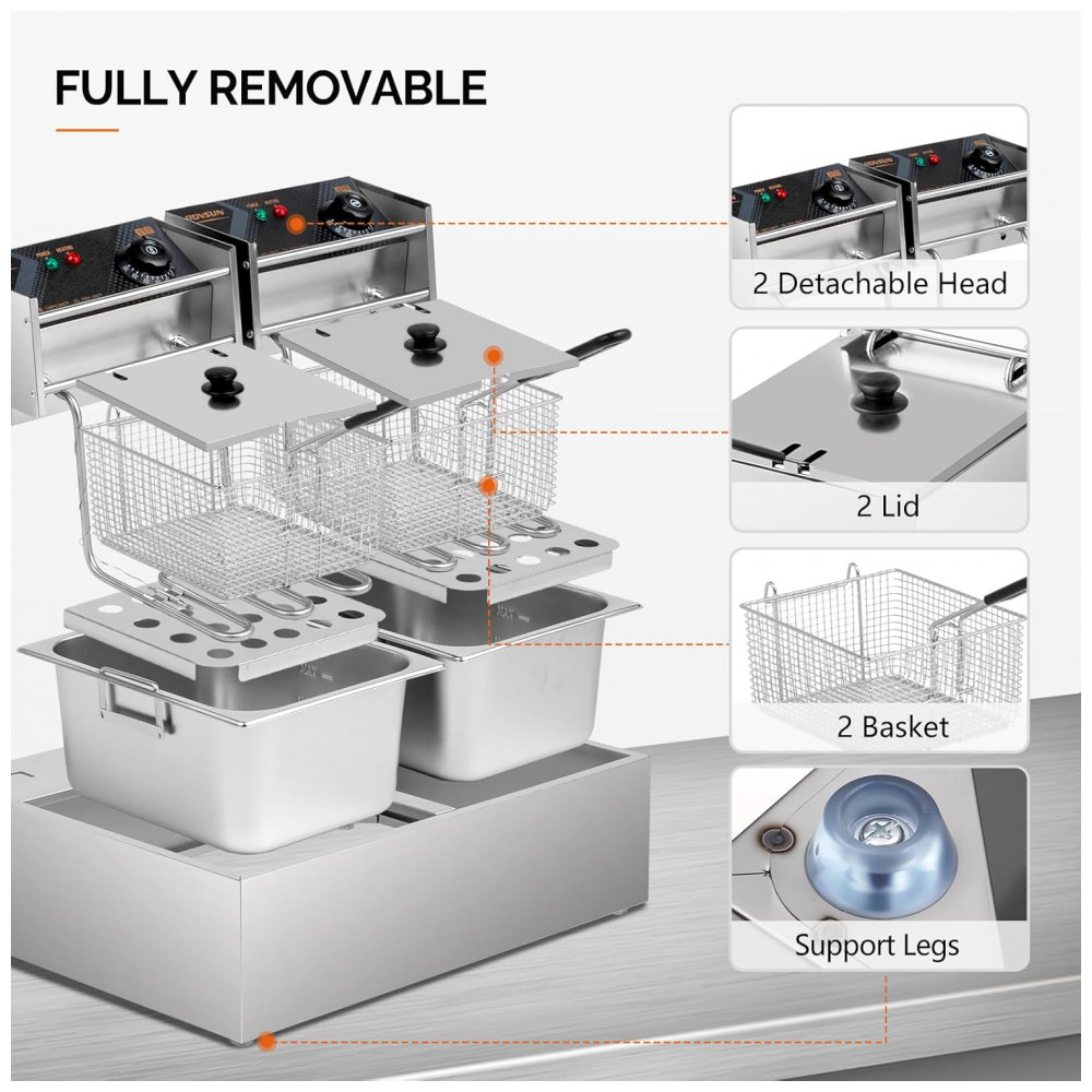 Capacidade de 21,6 Litros: Com cabeças elétricas duplas e plugues de energia para aplicação em tanque de grande capacidade, esta fritadeira dupla permite fritar diferentes alimentos a diferentes temperaturas ao mesmo tempo, economizando seu tempo na cozinha. A capacidade total máxima é de 21,6 litros, com capacidade de óleo recomendada de até 12,96 litros. Capacidade de cada cesto: 4 litros. (O produto vem com filmes protetores brancos nas molduras e tampas. Remova-os antes de usar.)
