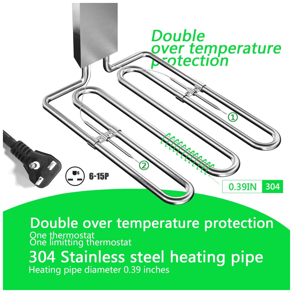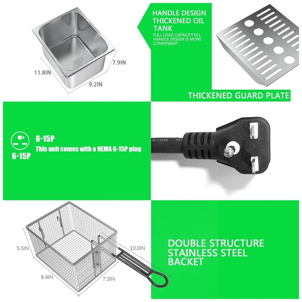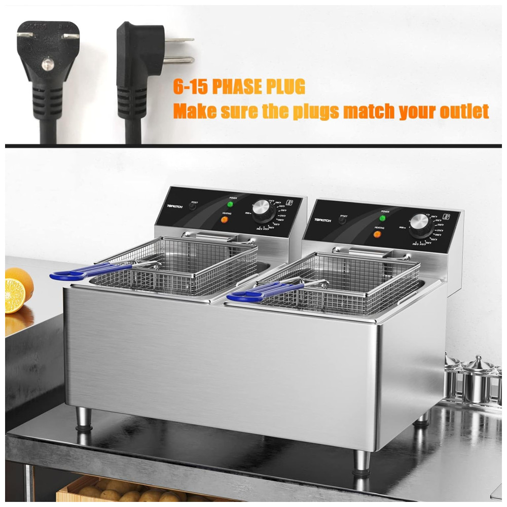Design de alta potência Esta fritadeira está equipada com um poderoso elemento de aquecimento de 3300W em cada bacia que garante fritar ou aquecer alimentos rapidamente e manter a temperatura do óleo Esta fritadeira de bancada de alta potência oferece maior eficiência de aquecimento para cozimento mais rápido e maior produção em uma área compacta de bancada Perfeito para fritar batatas fritas, peixe, frango, rosquinhas, bolinhos, anéis de cebola, camarão, batata frita e etc