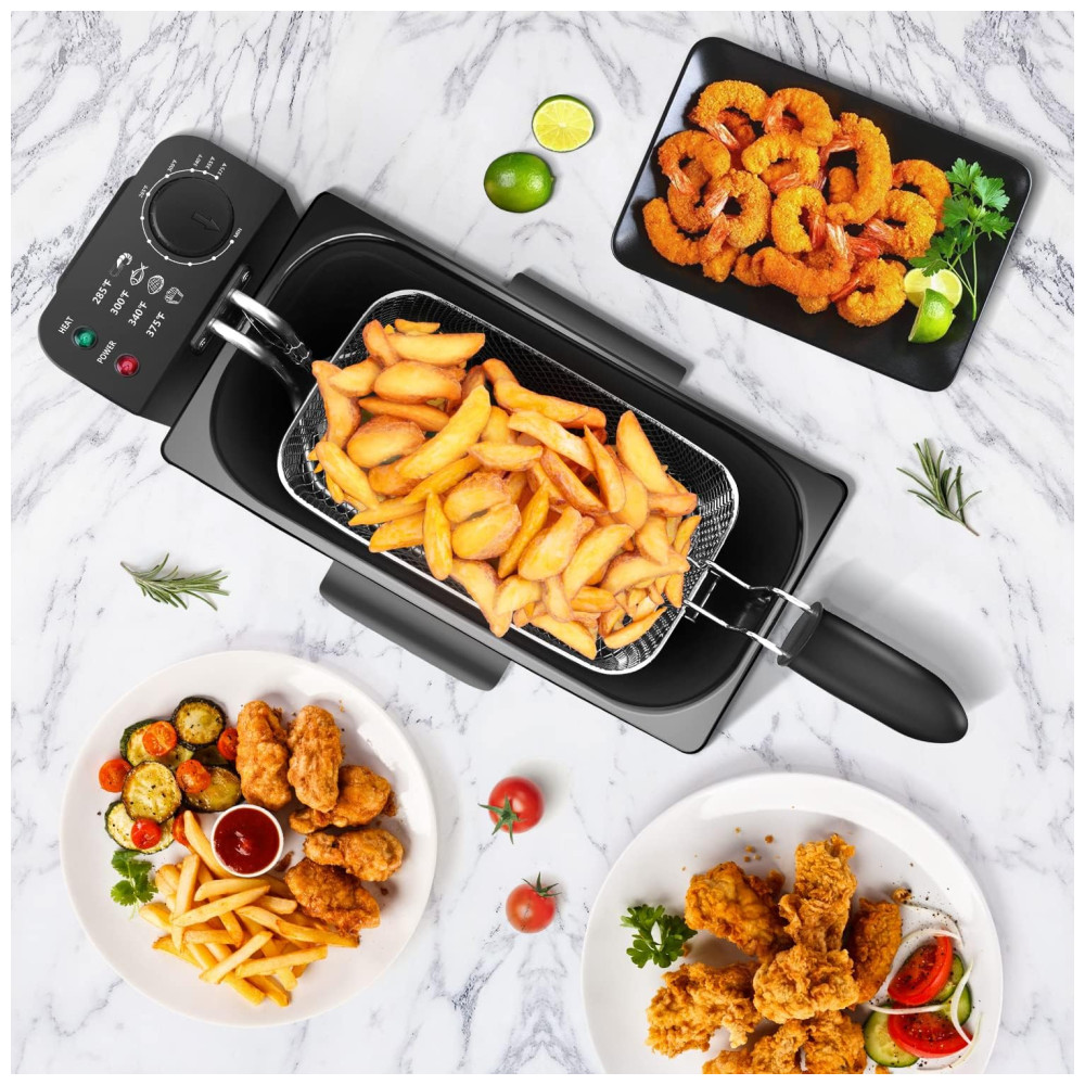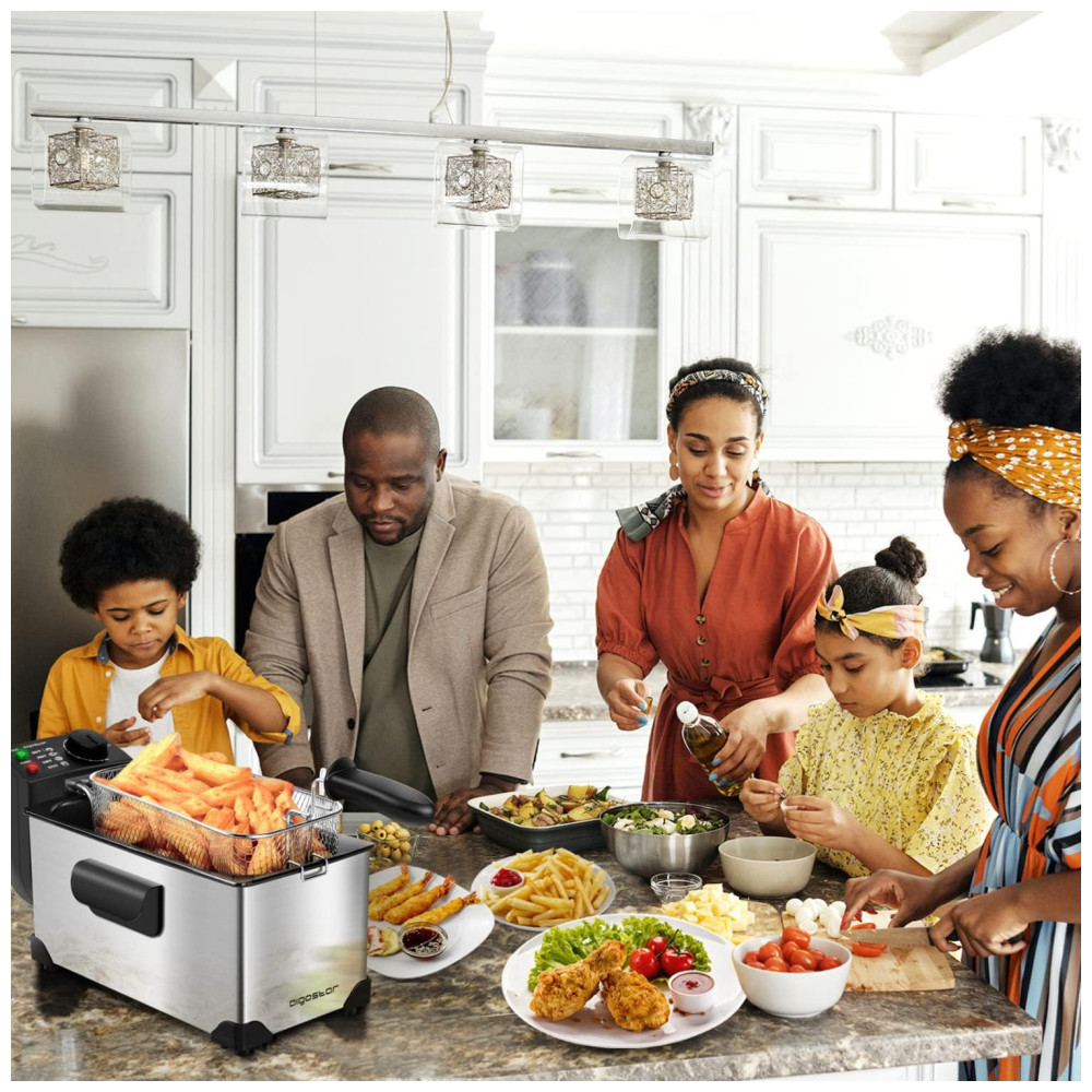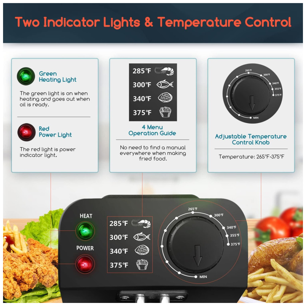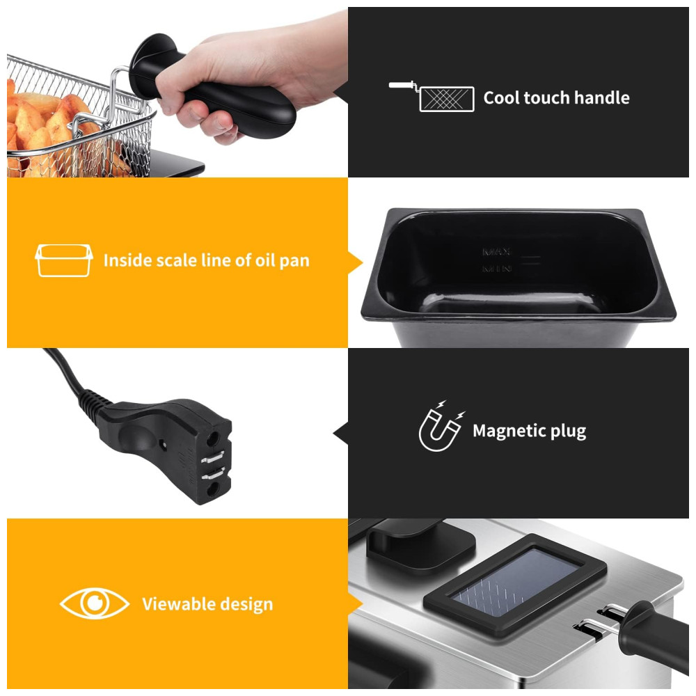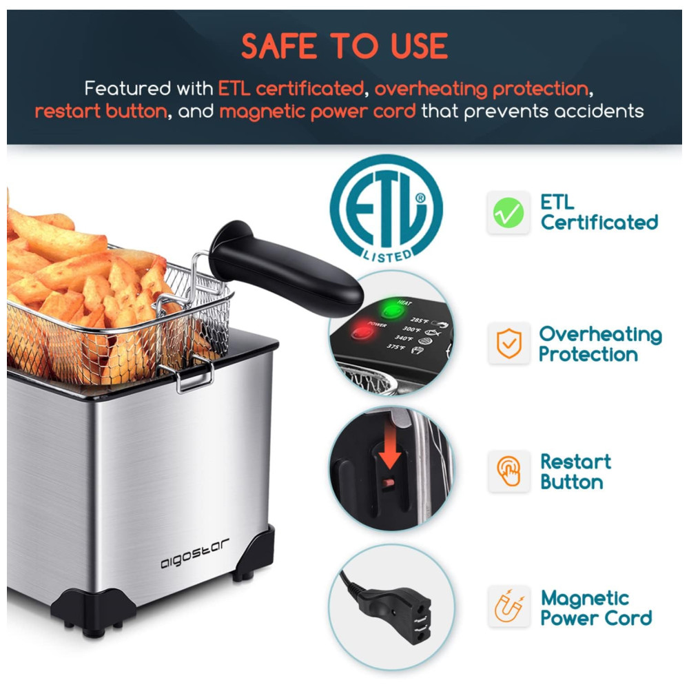 Segurança Garantida: Com certificação ETL e proteção contra superaquecimento, a fritadeira desliga automaticamente após uso prolongado. Para reativá-la, basta reiniciar o termostato. A tampa antirrespingo previne acidentes com óleo quente, enquanto as almofadas antiderrapantes na base aumentam a estabilidade durante o uso.