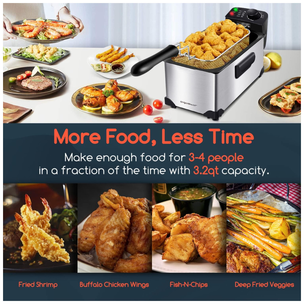 Controle de Temperatura Ajustável: Com um controle de temperatura que varia de 0°C a 190°C, você pode ajustar a fritadeira para preparar uma variedade de pratos, desde anéis de cebola e asas de frango frito até camarões, batatas fritas, rolinhos primavera, costeletas de porco, e muito mais. As alças com toque frio garantem segurança e conforto durante o manuseio.