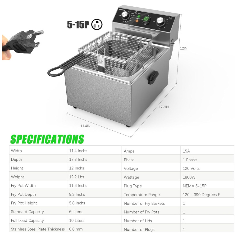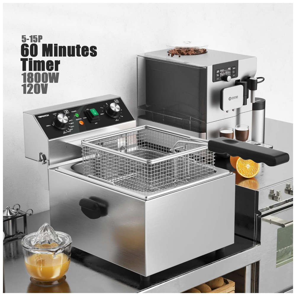 Fritadeira Profissional: Durável tanto para uso comercial quanto doméstico, esta fritadeira de aço inoxidável é perfeita para restaurantes, supermercados, quiosques de fast food, bares de lanches, food trucks e festas. Todos os componentes desta fritadeira podem ser removidos facilmente para acelerar o processo de limpeza. Ideal para preparar buffalo wings, frango, bolinhos, rolinhos primavera, rolinhos de camarão, palitos de mussarela, jalapeños recheados e muito mais.