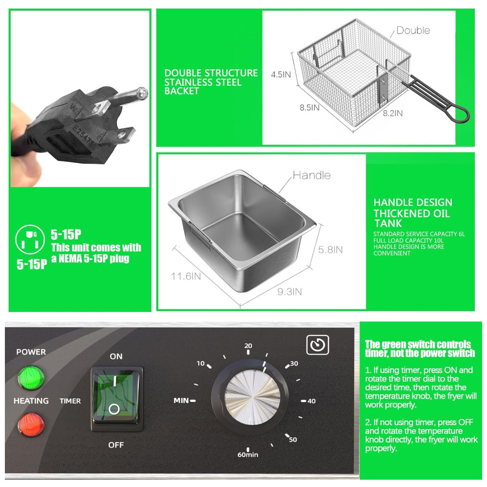 Fritadeira de Alta Qualidade: Esta fritadeira elétrica de bancada é feita de aço inoxidável pesado de grau comercial e cumpre o padrão ETLus. Os acabamentos das bordas são suaves. Com mais de 10 anos de experiência em equipamentos de cozinha, nossa fábrica oferece produtos de alta qualidade e um serviço de pós-venda confiável.