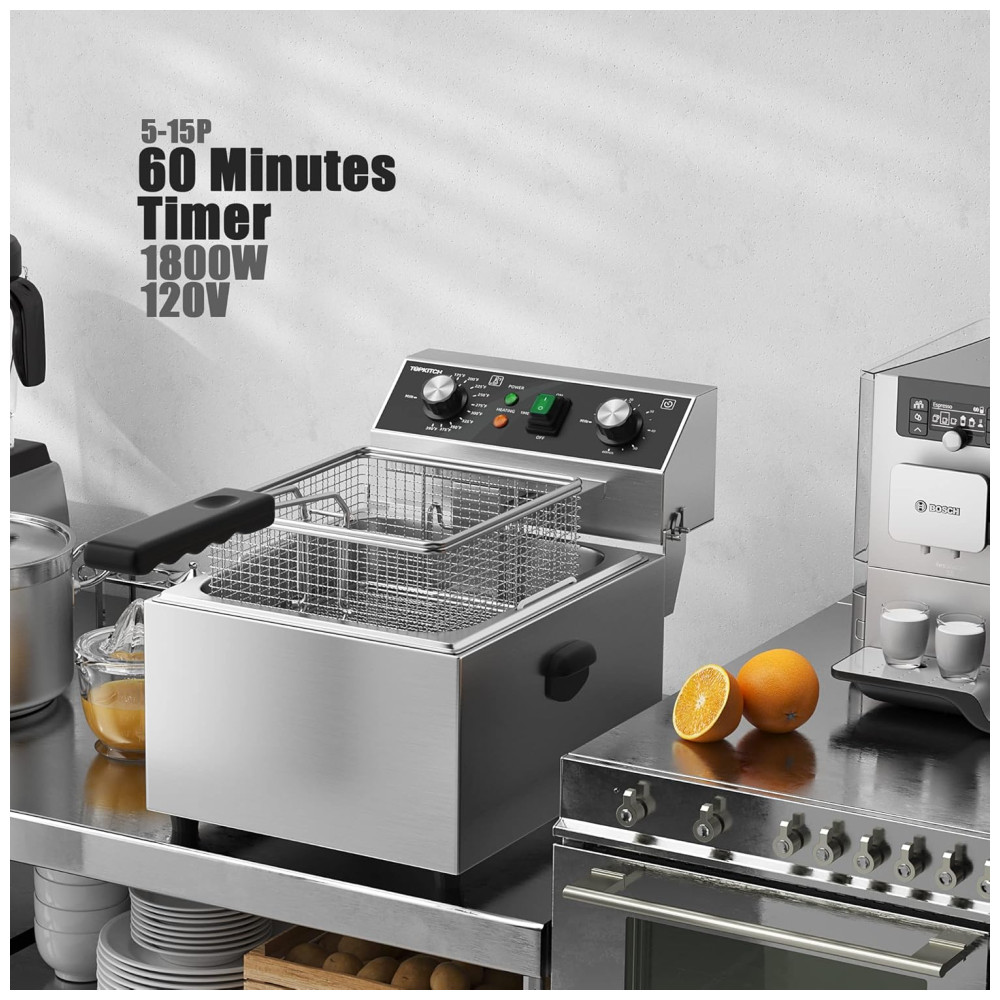 Desempenho Poderoso: Esta fritadeira com tanque único é equipada com um potente elemento de aquecimento de 1800W e 110V, garantindo que os alimentos sejam fritos ou aquecidos rapidamente, mantendo a temperatura do óleo constante. Perfeita para aplicações de uso leve, como delicatessens, pequenas lanchonetes, quiosques e uso doméstico. Seu design compacto permite que ela se encaixe em qualquer canto do balcão, enquanto a construção em aço inoxidável pesado adiciona durabilidade prolongada.