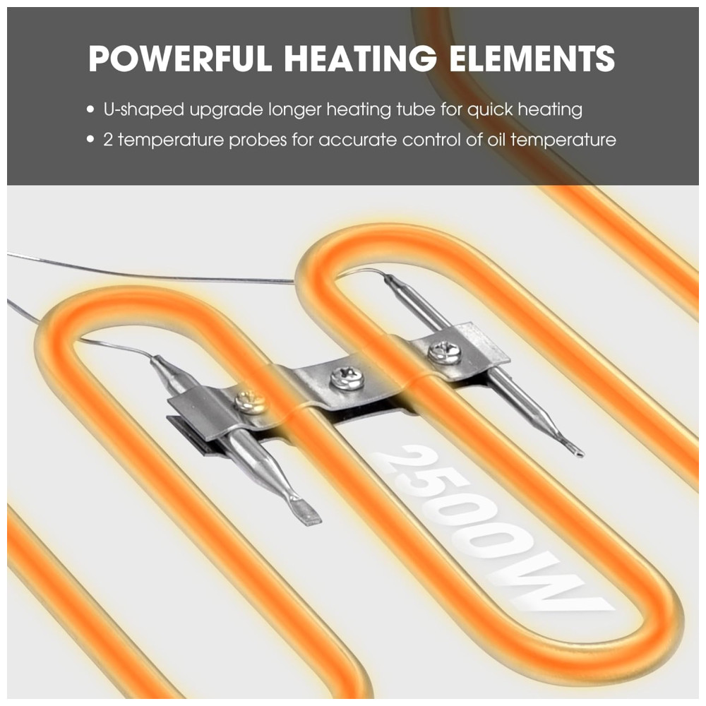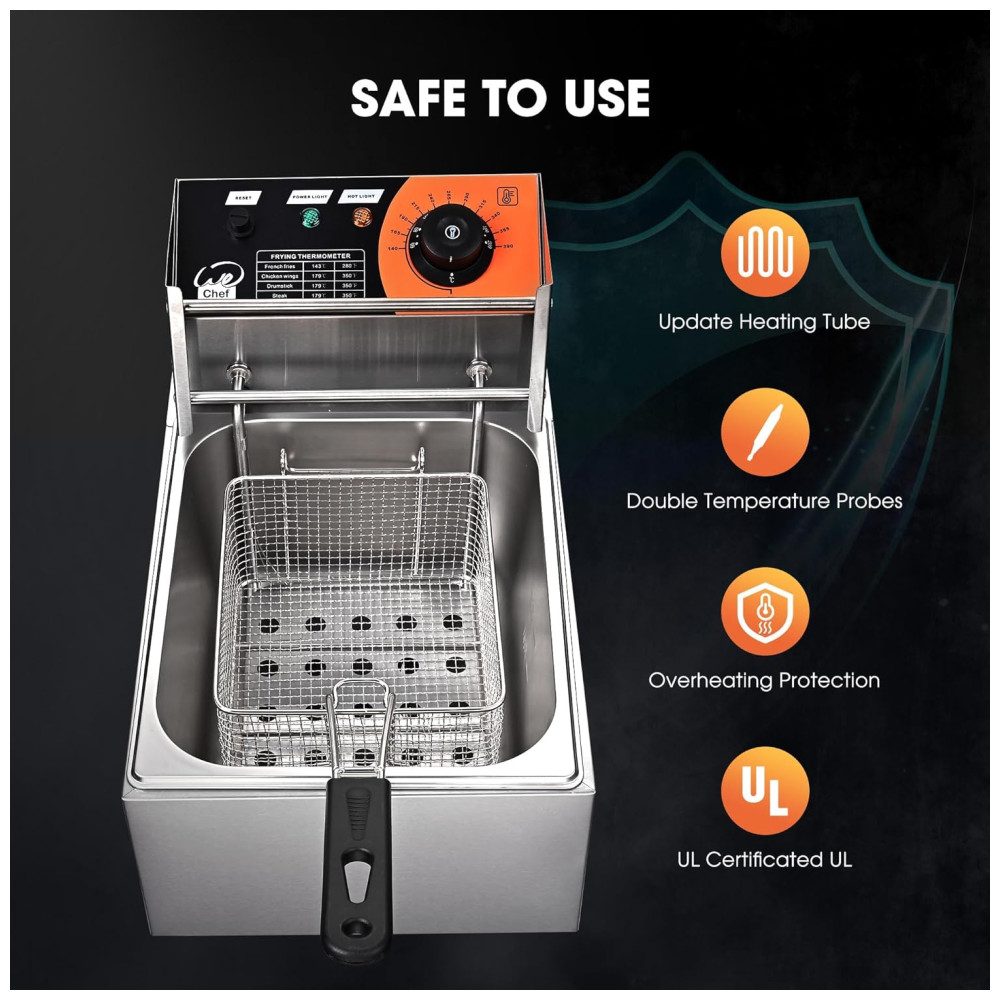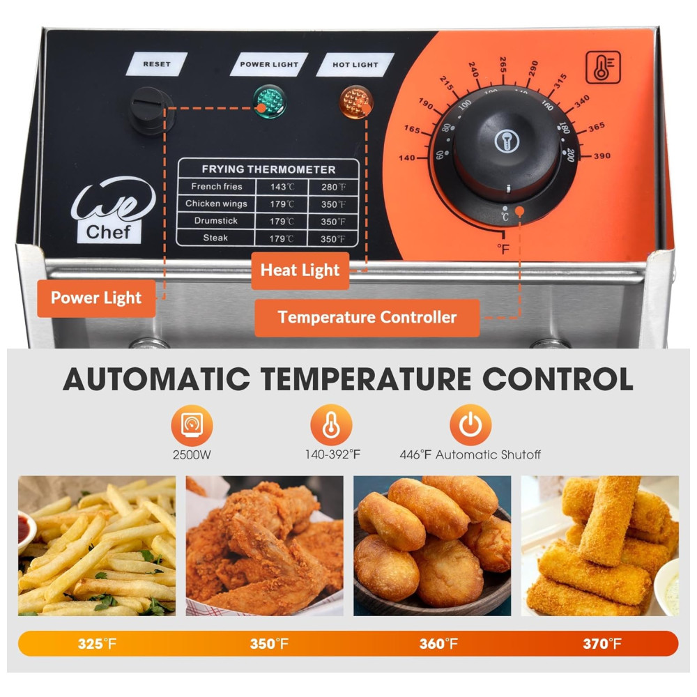 Aquecimento Rápido: Com 110V e 2500W, a Fritadeira WeChef possui tubo de aquecimento certificado pela UL, garantindo aquecimento rápido e seguro. Frita até 1,36 kg de batatas fritas em menos de 15 minutos, ideal para preparo de anéis de cebola, frango frito e outros alimentos fritos em grandes quantidades.
