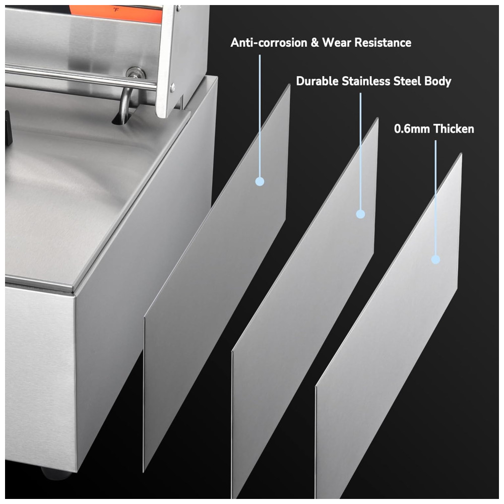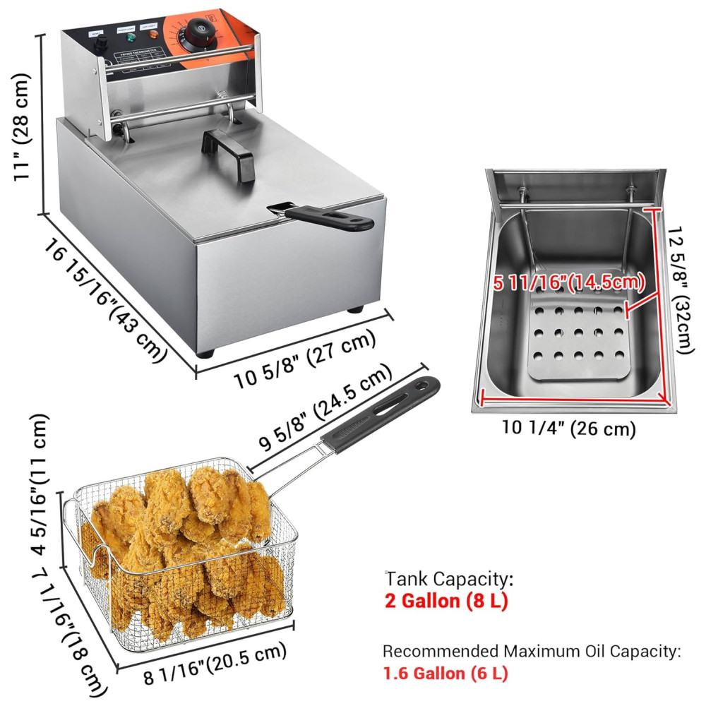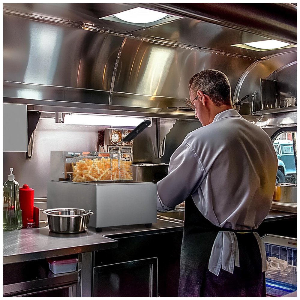 Durabilidade e Grande Capacidade: Fabricada em aço inoxidável espesso de 0,6 mm, garantindo durabilidade, robustez e resistência à corrosão. Inclui um tanque com capacidade de 8 litros, ideal para fritar grandes quantidades de alimentos, como 5 porções de asas de frango ou 1,36 kg de batatas fritas, atendendo perfeitamente às necessidades comerciais.