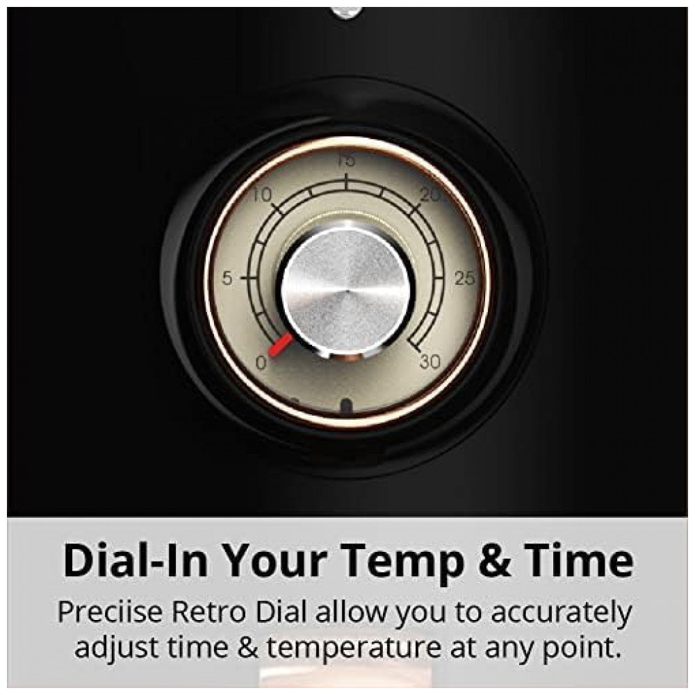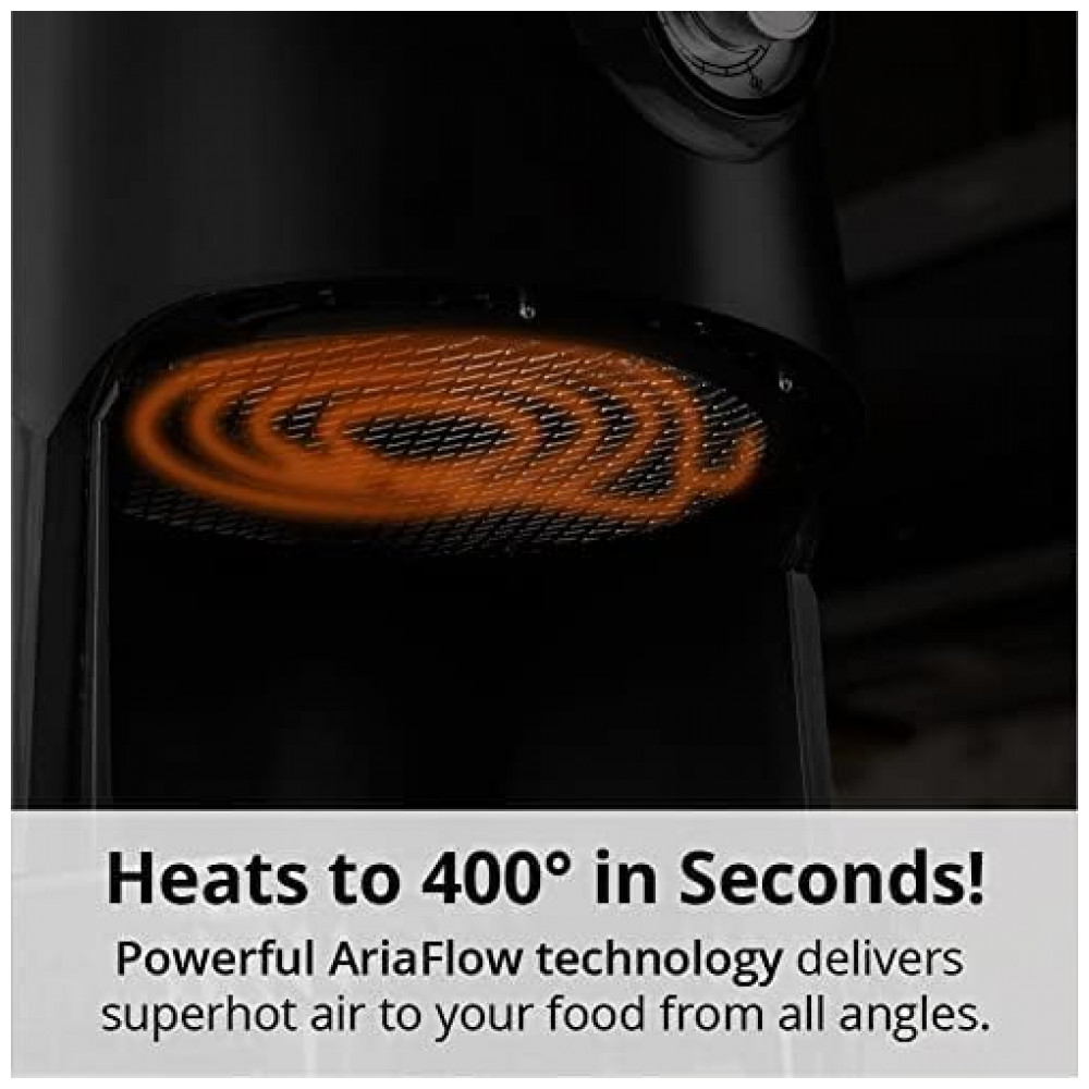 A tecnologia AriaFlow de circulação de ar quente garante pré-aquecimento rápido e distribuição uniforme do calor, alcançando até 204°C em segundos. O sistema de dials analógicos possibilita ajuste em tempo real dos parâmetros de tempo e temperatura, facilitando o preparo personalizado de cortes de carnes, batatas, legumes, aperitivos, refeições congeladas e reaquecimento de sobras.