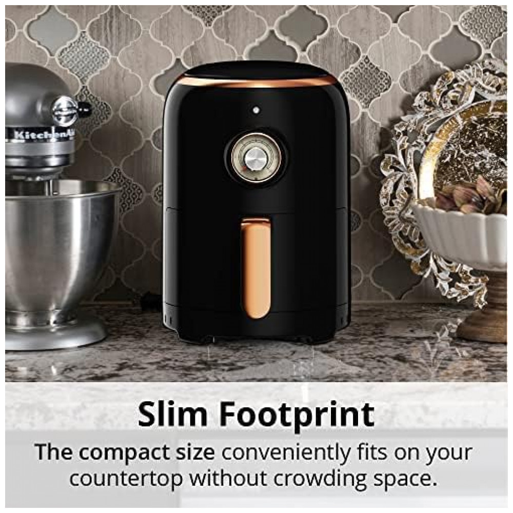 O aparato apresenta estrutura compacta, indicada para bancadas de cozinhas residenciais, apartamentos, dormitórios e ambientes com espaço reduzido. O cesto de 1,9 litros (2QT) é lavável em lava-louças, reduzindo o tempo de limpeza. O produto inclui ainda livro de receitas colorido com opções clássicas, veganas e low carb para início imediato do uso.