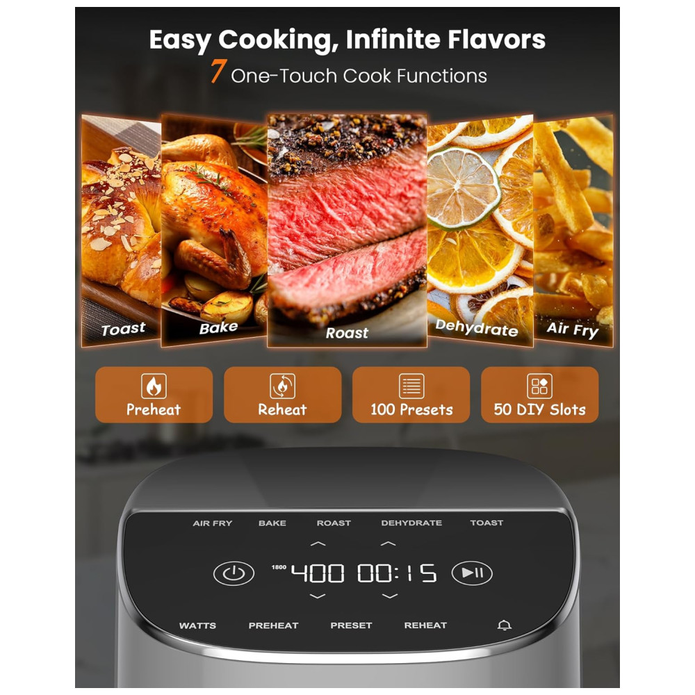 Em 2025, a fritadeira sem óleo Brio Plus apresenta um Design, Funções e Desempenho aprimorados, além de novas cores modernas! Baseados em feedbacks, realizamos melhorias incríveis. Cozinhe refeições mais saudáveis com estilo, graças aos ajustes avançados e interface amigável. COZINHE 4X MAIS RÁPIDO, DE MANEIRA MAIS UNIFORME A tecnologia de Convecção Turbo Avançada da Brio 2025, com ventilador de aquecimento, juntamente com potência de 700-1500-1800W, promove circulação cíclica de convecção. Desfrute de preparo de refeições mais rápido, com cascas crocantes e douradas e interiores suculentos. 7 FUNÇÕES COM UM TOQUE E 150 RECEITAS PRÉ-PROGRAMADAS Desfrute de 7 funções versáteis: Fritar, Assar, Torrar, Desidratar, Aquecer, Pré-aquecer. Com 100 receitas pré-programadas e 50 slots personalizáveis, a Brio simplifica o seu cozimento e eleva a sua cozinha com um desempenho de primeira linha! CONTROLES COMPLETAMENTE DIGITAIS VIA TELA DE TOQUE Revolucione sua culinária com a fritadeira Brio Plus! Sua tela de toque digital oferece uma interface futurista e sem emendas, sem mais botões analógicos ou letras desbotadas. Desfrute de controle preciso e sem esforço na ponta dos dedos. REVESTIMENTO SAUDÁVEL LIVRE DE PFAS Cozinhe de forma mais saudável com revestimento cerâmico natural e antiaderente, livre de substâncias nocivas PFAS. Testado pela TUV para 106 elementos de PFAS conhecidos, o Revestimento Cerâmico Duralon Blue G10 garante que nenhum tenha sido detectado. Aproveite o cozimento seguro e sem preocupações! DISPLAY LED CRISTALINO Atualize sua cozinha com nosso vibrante display LED! Grandes letras e números brancos garantem fácil legibilidade em qualquer luz, tornando sua experiência culinária mais suave e conveniente. Transforme sua experiência na cozinha!