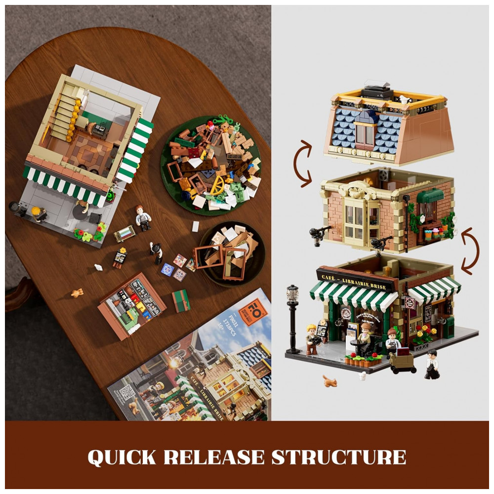 Conjunto de blocos de montar em plástico que representa um café livraria em estilo europeu dos anos 1990, com fachada em dois andares em tons quentes e volumetria típica de rua de cidade. A edificação traz vitrine frontal, marquise, porta principal e janelas amplas no pavimento superior, compondo um cenário urbano aconchegante.
