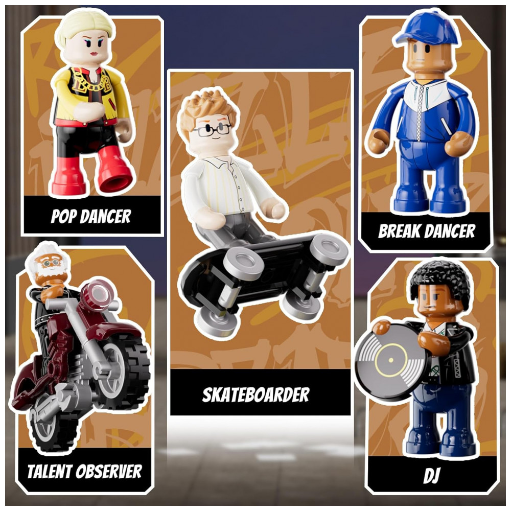 O conjunto traz cinco personagens com visual de cultura de rua, incluindo dançarinos, DJ, espectador e praticante de skate, permitindo criar múltiplas composições de apresentação. A plataforma de dança possui mecanismo interno por engrenagem que possibilita movimento giratório, simulando poses e giros durante a montagem manual.