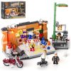 Conjunto de blocos de montar em plástico que representa um ponto de ônibus urbano inspirado em cenário de rua dos anos 1990, com abrigo, muro lateral, calçada e pequeno espaço de feira. A ambientação destaca elementos de cultura de rua, com grafites, lixeira tematizada, tampa de bueiro e jornais espalhados para compor uma cena urbana detalhada.