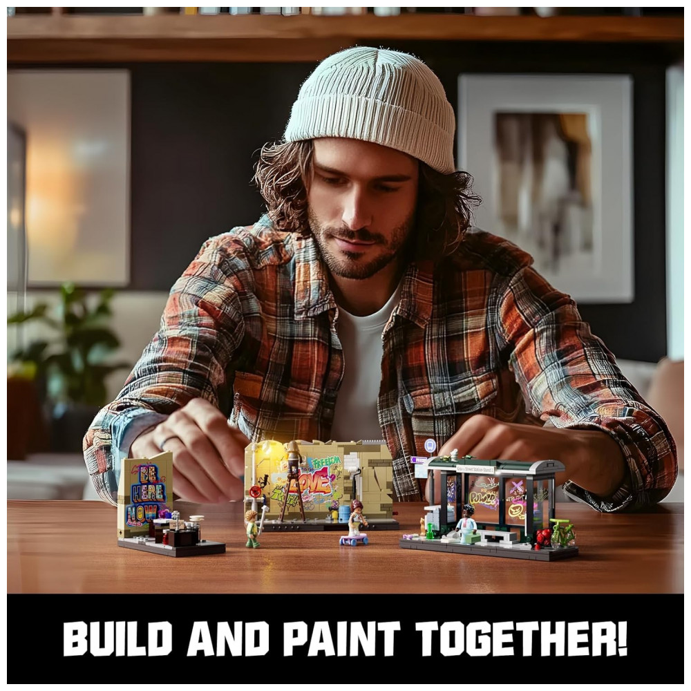 As peças impressas incluem murais de grafite em grande formato e ilustrações de animais estilizados, criando um painel visual de destaque no fundo do cenário. O conjunto traz minifiguras com visual de rua, como artista de grafite, usuária de skate, trabalhadora e passageira, permitindo montar diferentes interações no ponto de ônibus.