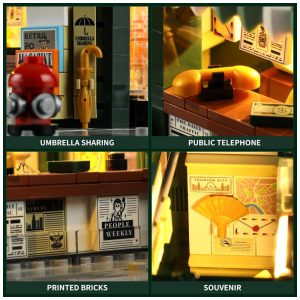 O ambiente reproduz elementos de vida cotidiana, com espaço para circulação de pedestres e acessórios como bicicleta, hidrante e pequenos itens urbanos ao redor. O formato de base reduzida facilita a inserção da banca entre prédios modulares maiores em dioramas de cidade.