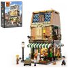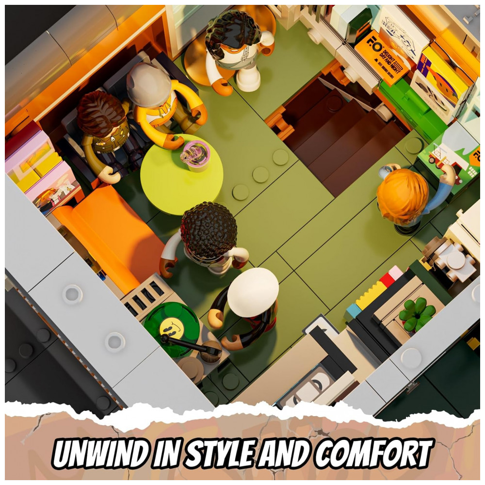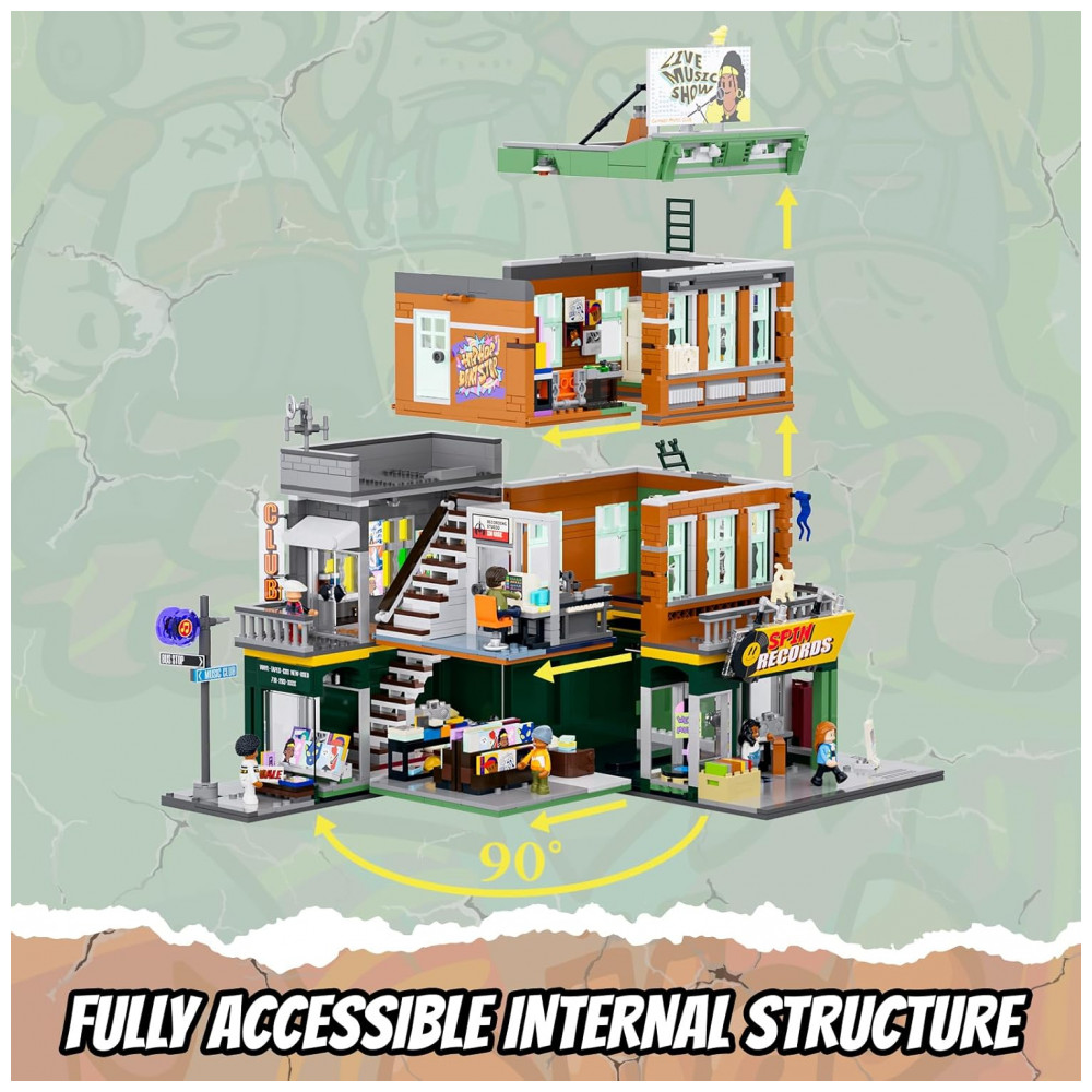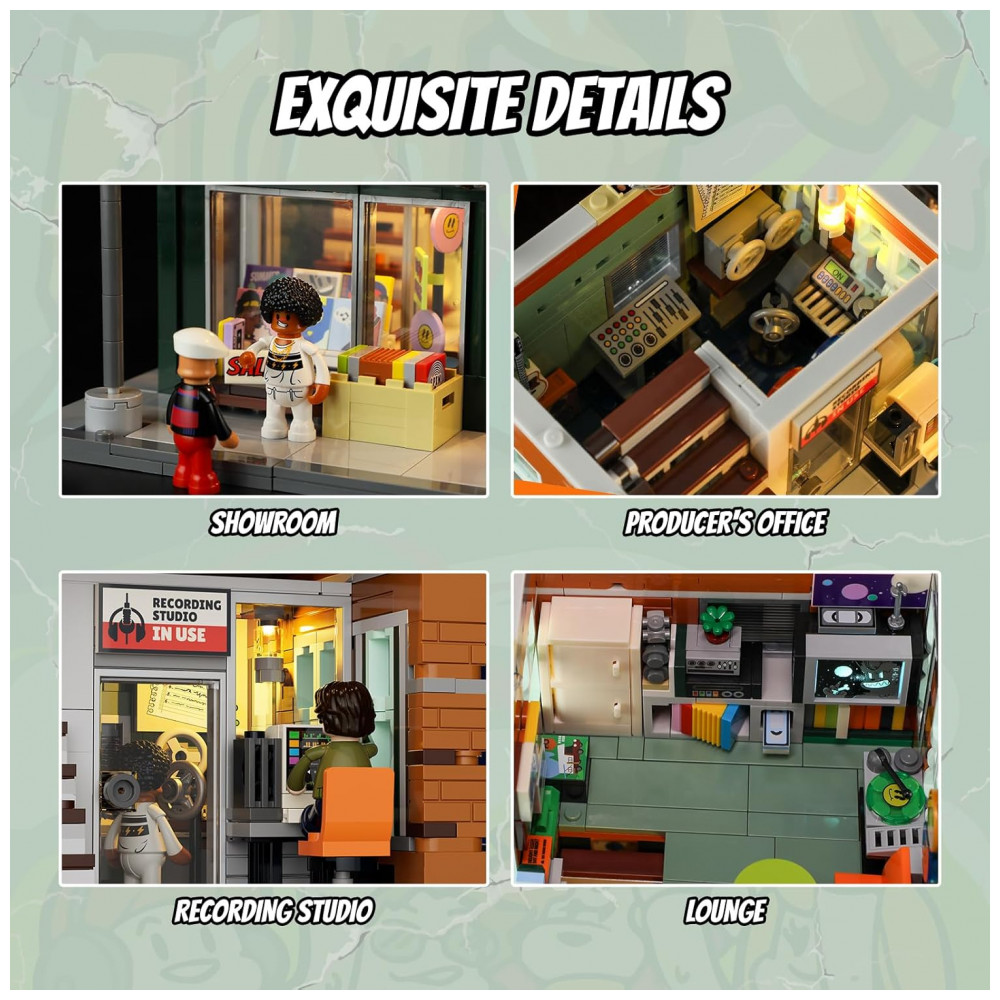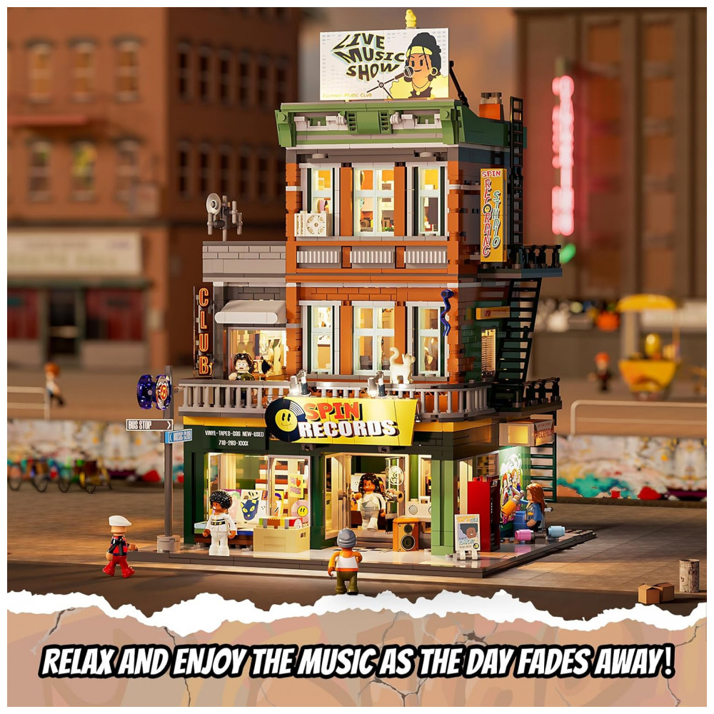 Conjunto de blocos de montar em plástico que representa uma loja de discos em ambiente urbano, com três níveis funcionais: área de venda de discos no térreo, estúdio de gravação no segundo piso e lounge para encontros e atividades musicais no terceiro andar. A fachada utiliza elementos de cultura de rua, com letreiros, vitrines e painéis decorativos associados a música e hip-hop.
